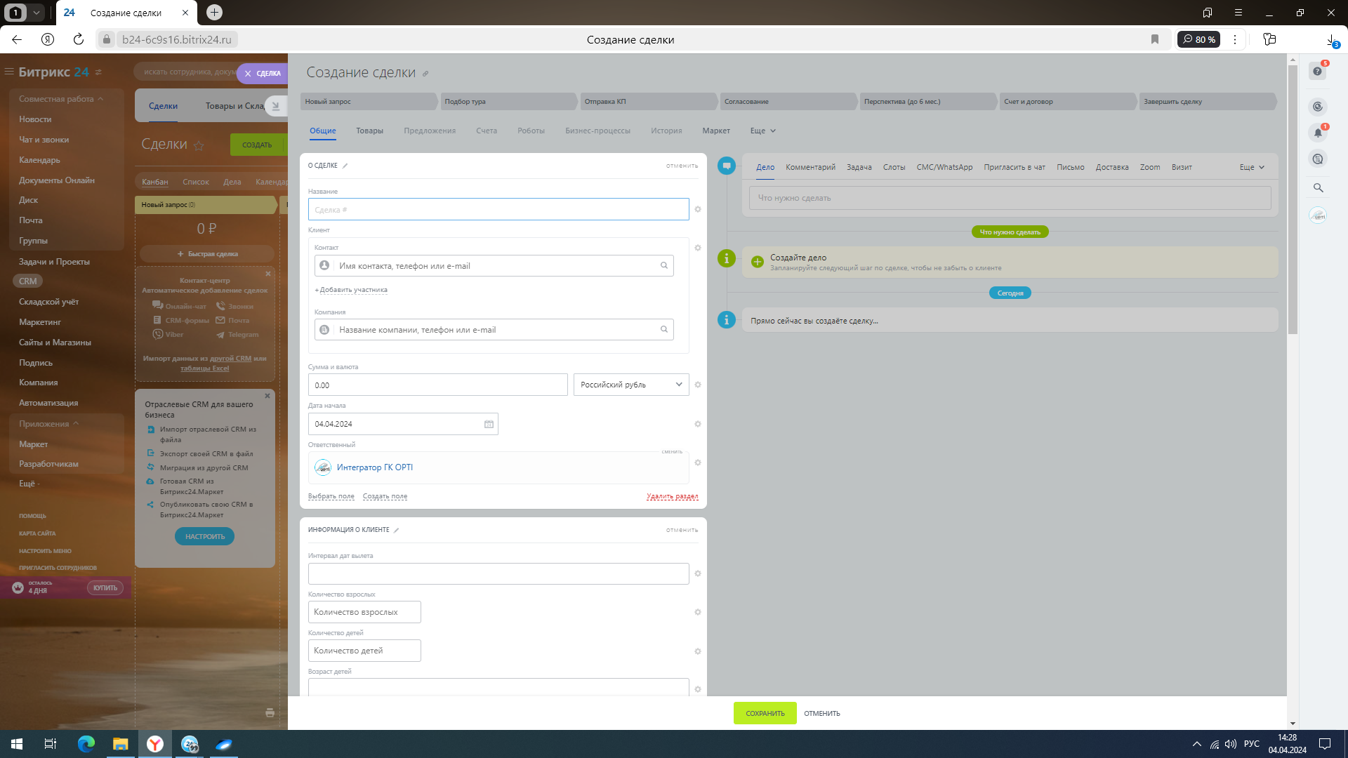 На стадии «Подбор тура» происходит изменение названия сделки и ставится задача на ответственного менеджера «Подобрать тур». Зафиксировать информацию в сделке по интервалу дат вылета, количеству взрослых, количеству детей, возрасту детей, количеству дней и питанию. После того как задача будет завершена, происходит смена стадии на «Отправка КП».