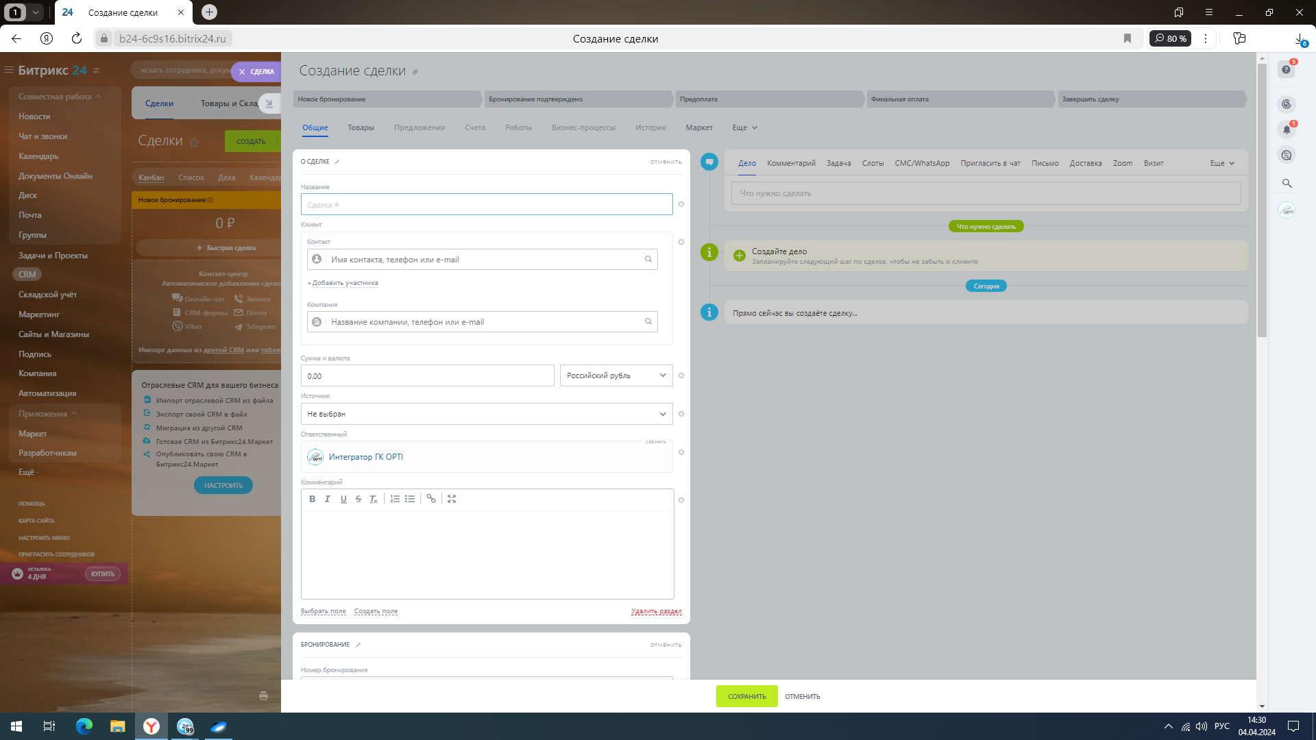 На стадии «Бронирование» происходит копирование сделки в воронку «Бронирование» на стадию «Новое бронирование».