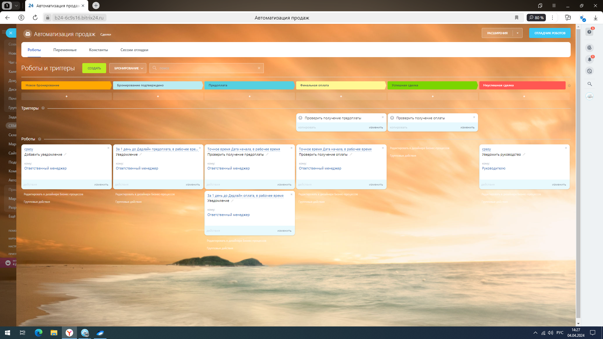 На стадии «Бронирование подтверждено» за один день до даты внесения предоплаты отправляется уведомление ответственному сотруднику о том, что завтра наступает день внесения предоплаты.