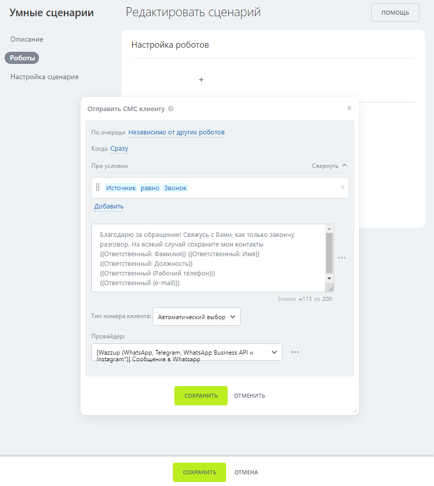 Сценарий позволяет отправить готовое сообщение клиенту в мессенджеры