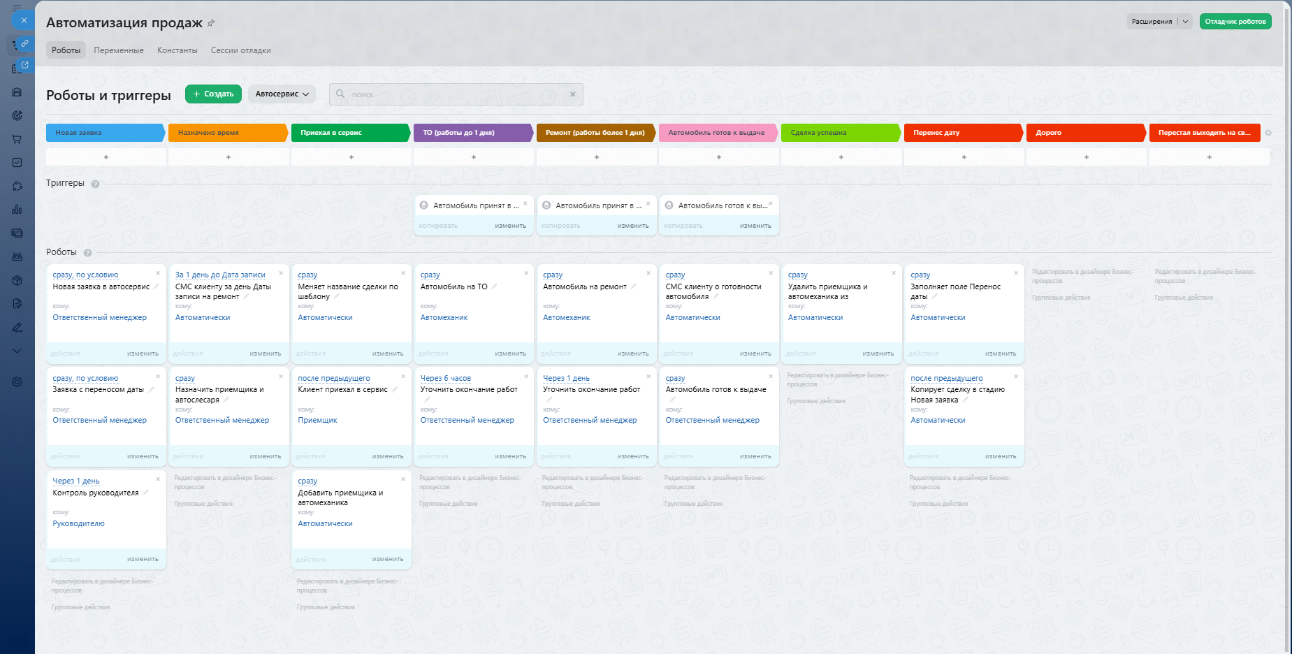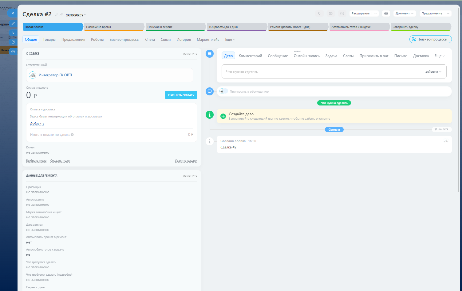 На стадии «ТО (работы до 1 дня)» и «Ремонт (работы больше 1 дня)» сделка перемещается автоматически, после того, как ответственный заполнит поле «Автомобиль принят в работу».