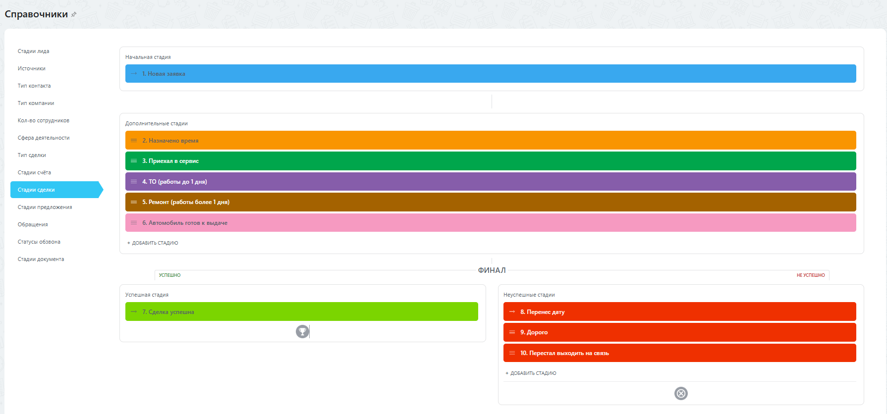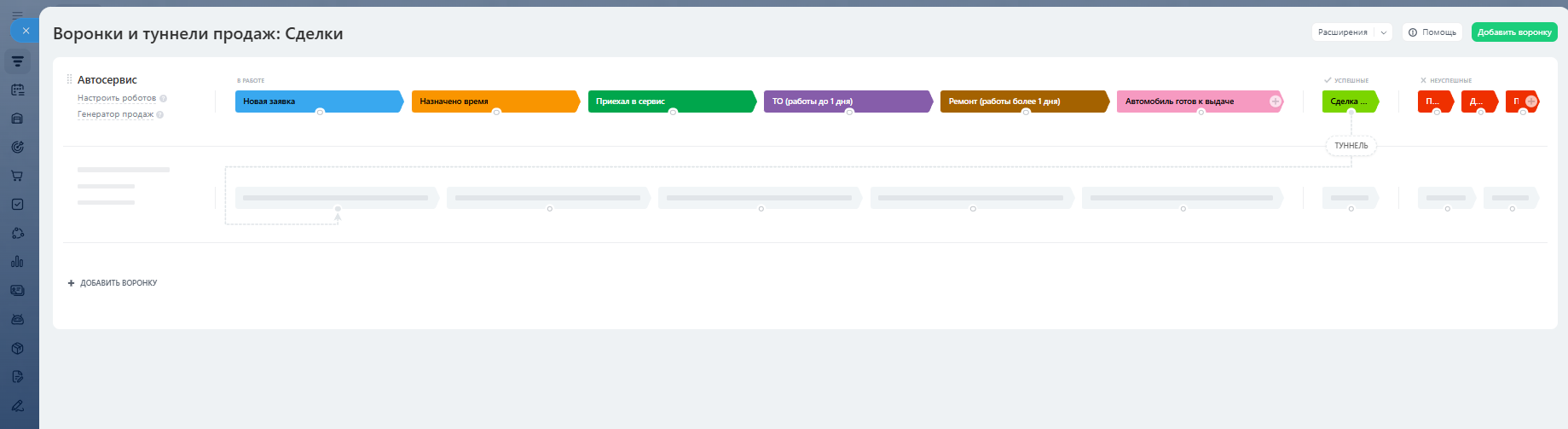 В CRM "Автосервис" настроена 1 воронка сделок: