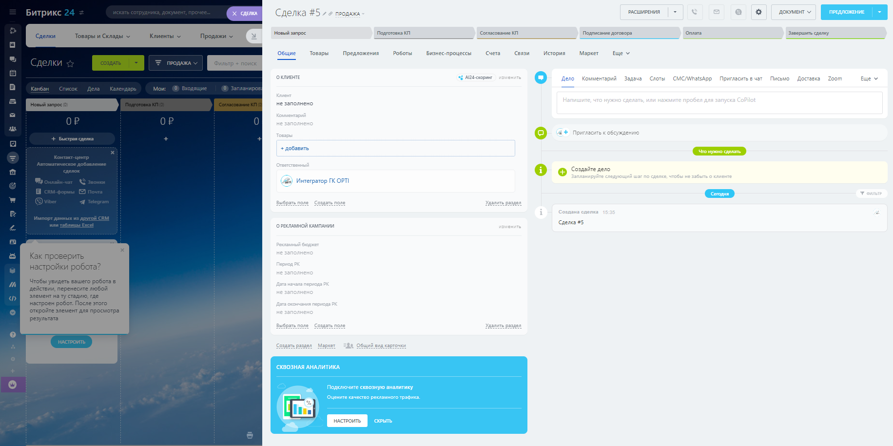 На стадии «Подготовка КП» планируется дело на ответственного «Подготовить и отправить КП».