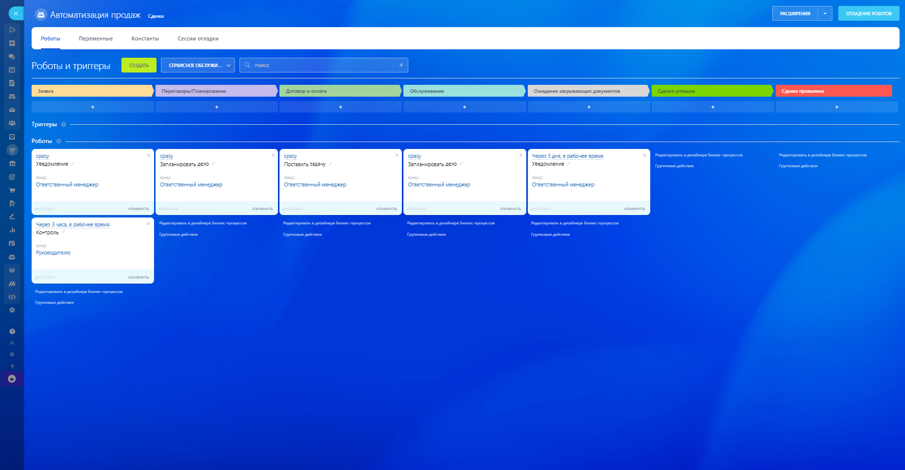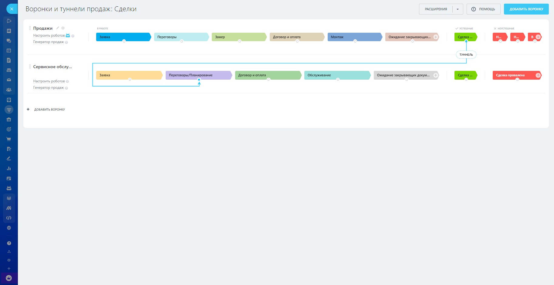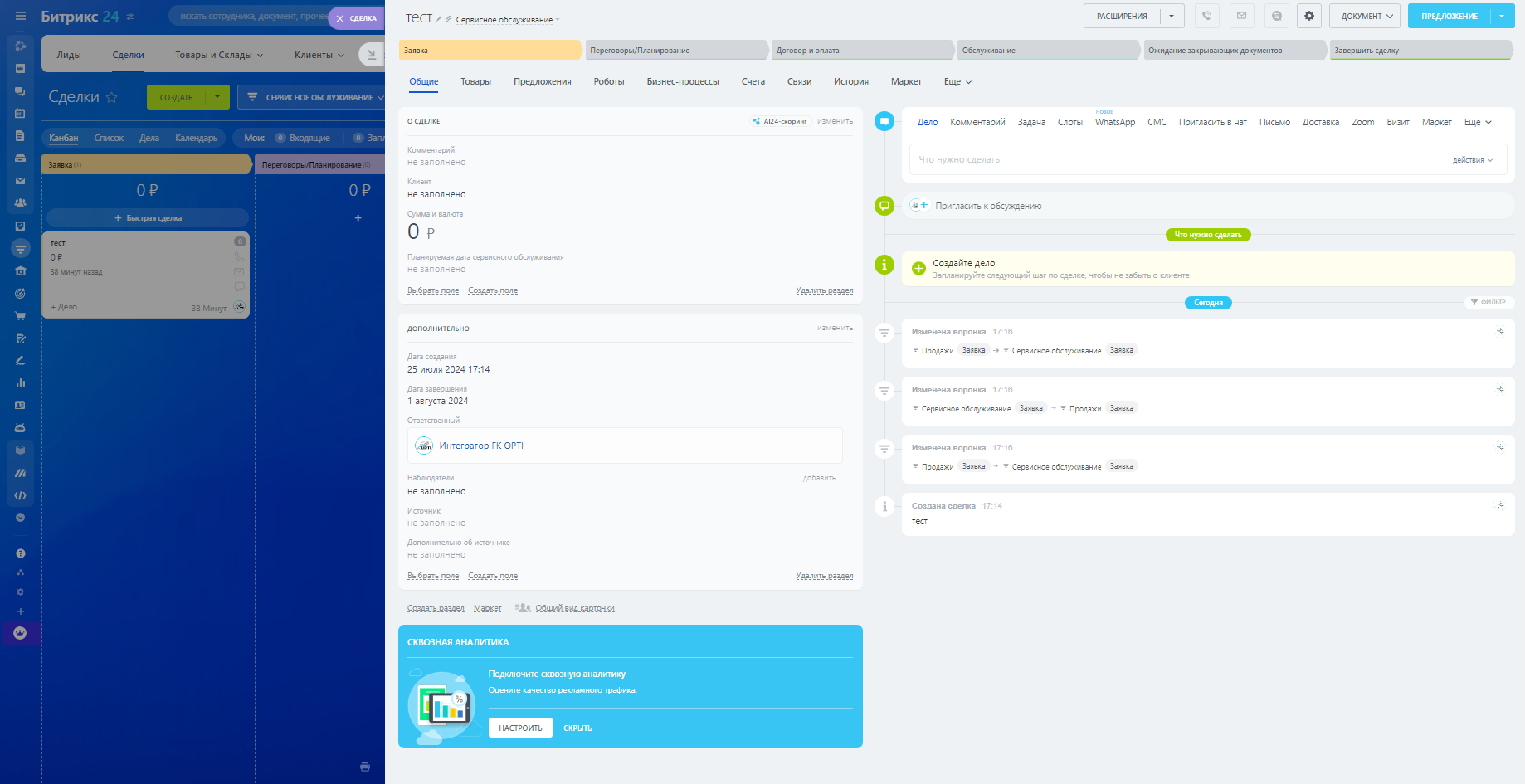 - Сделка успешна. Сделка копируется в воронку Сервисное обслуживание