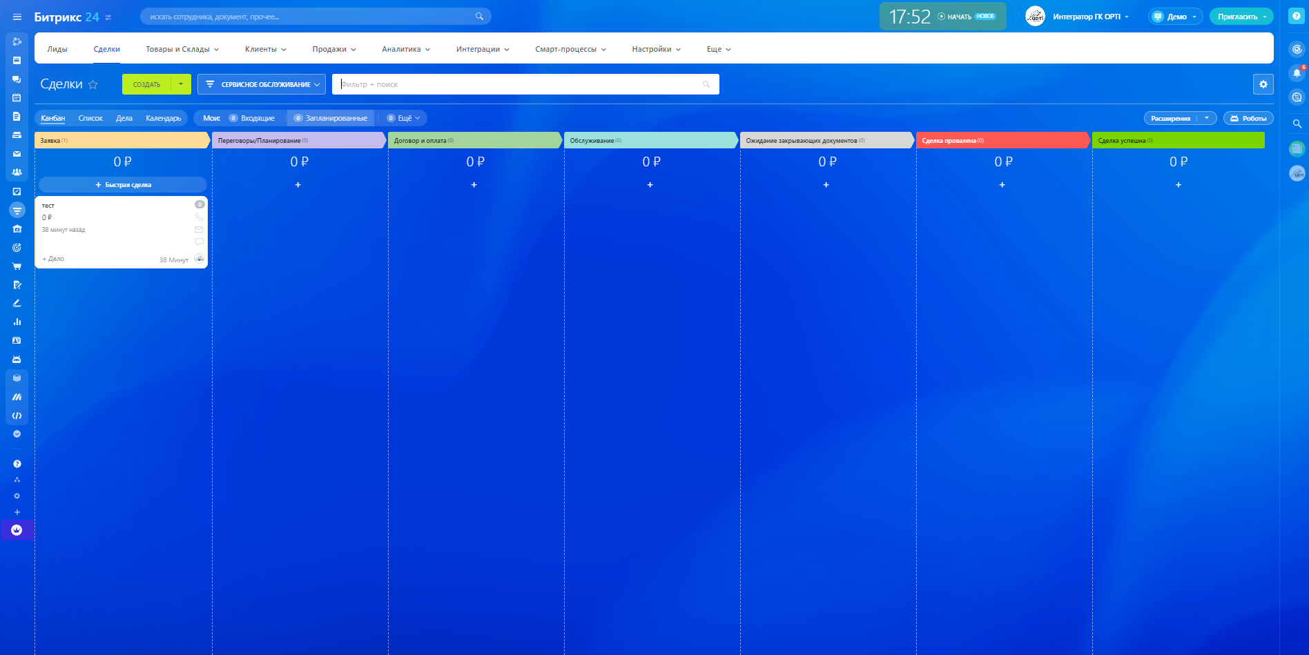 - Обслуживание. Планируется дело о необходимости провести сервисное обслуживание, дата заполняется автоматически из поля "Планируемая дата сервисного обслуживания", которое менеджер заполняет в карточке Сделки на этапе переговоров с клиентом