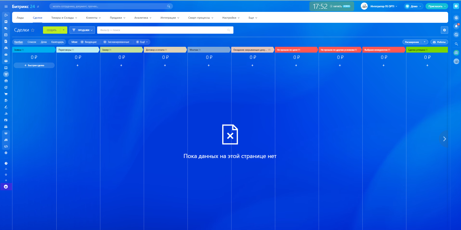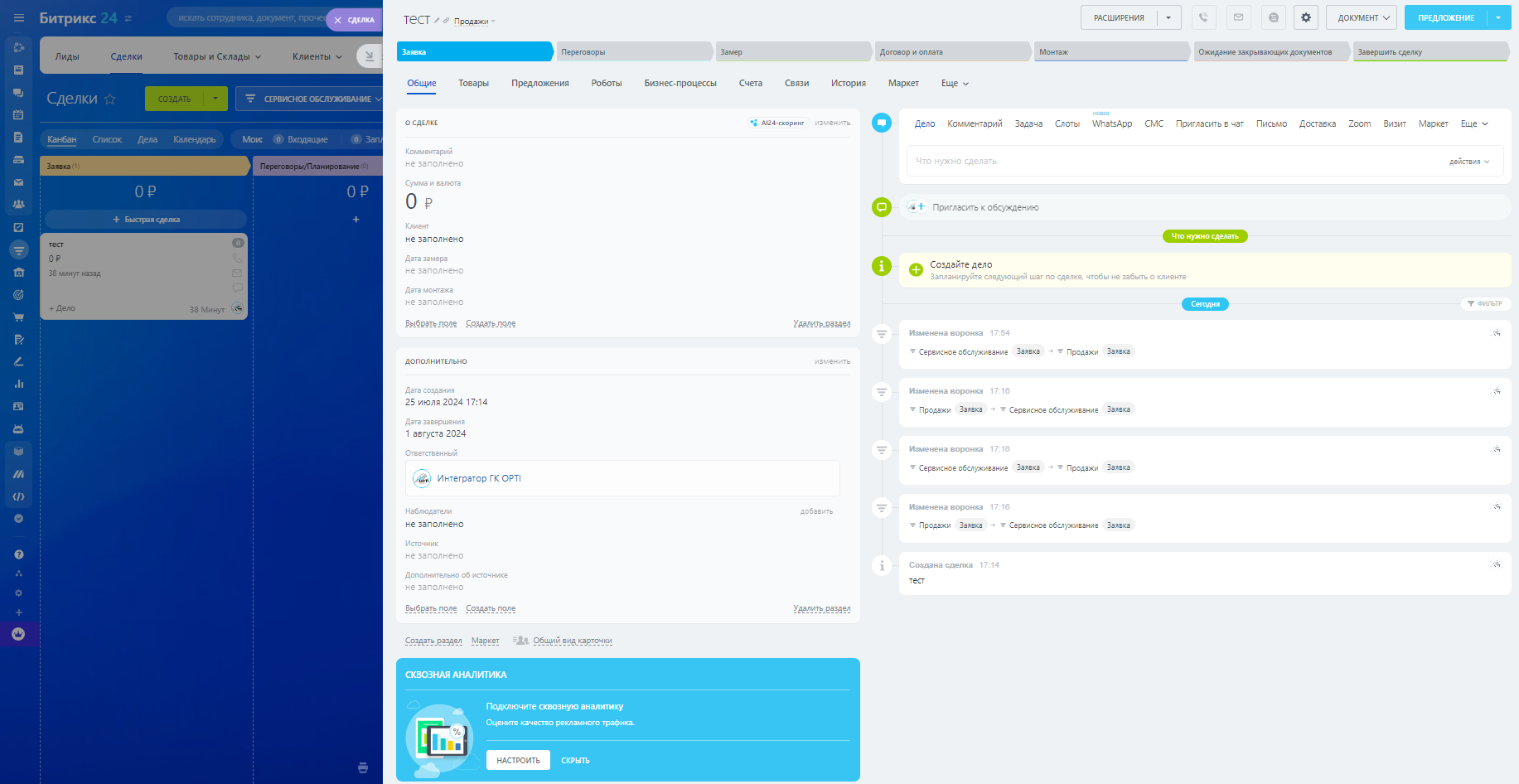 - Монтаж. Планируется дело о необходимости произвести монтаж, дата заполняется автоматически из поля "Дата монтажа", которое менеджер заполняет в карточке Сделки на этапе переговоров с клиентом