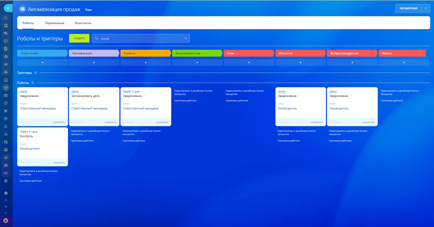 - В работе. Отправляется уведомление ответственному, при нахождении ЛИДа в данной стадии более 3-х дней