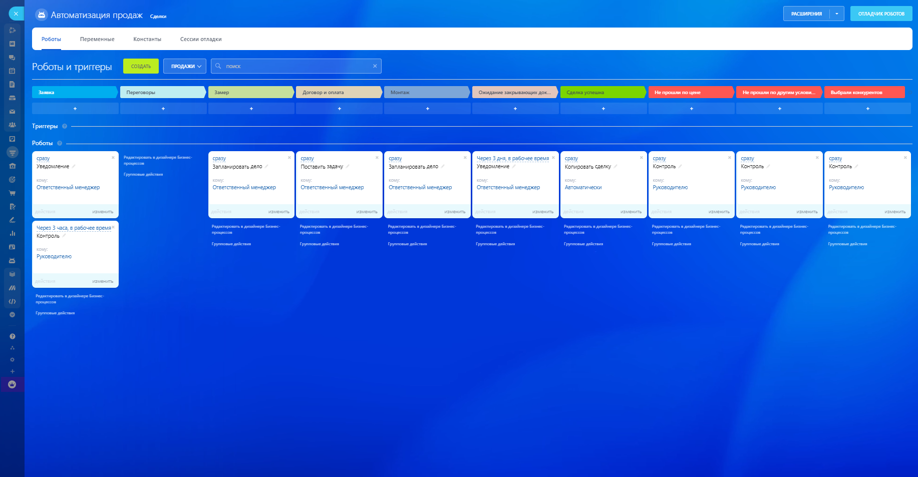 - Заявка. Отправляется уведомление ответственному о том, что нужно взять заявку в работу. Если Сделка находится на данной стадии более 3-х часов, отправляется уведомление руководителю