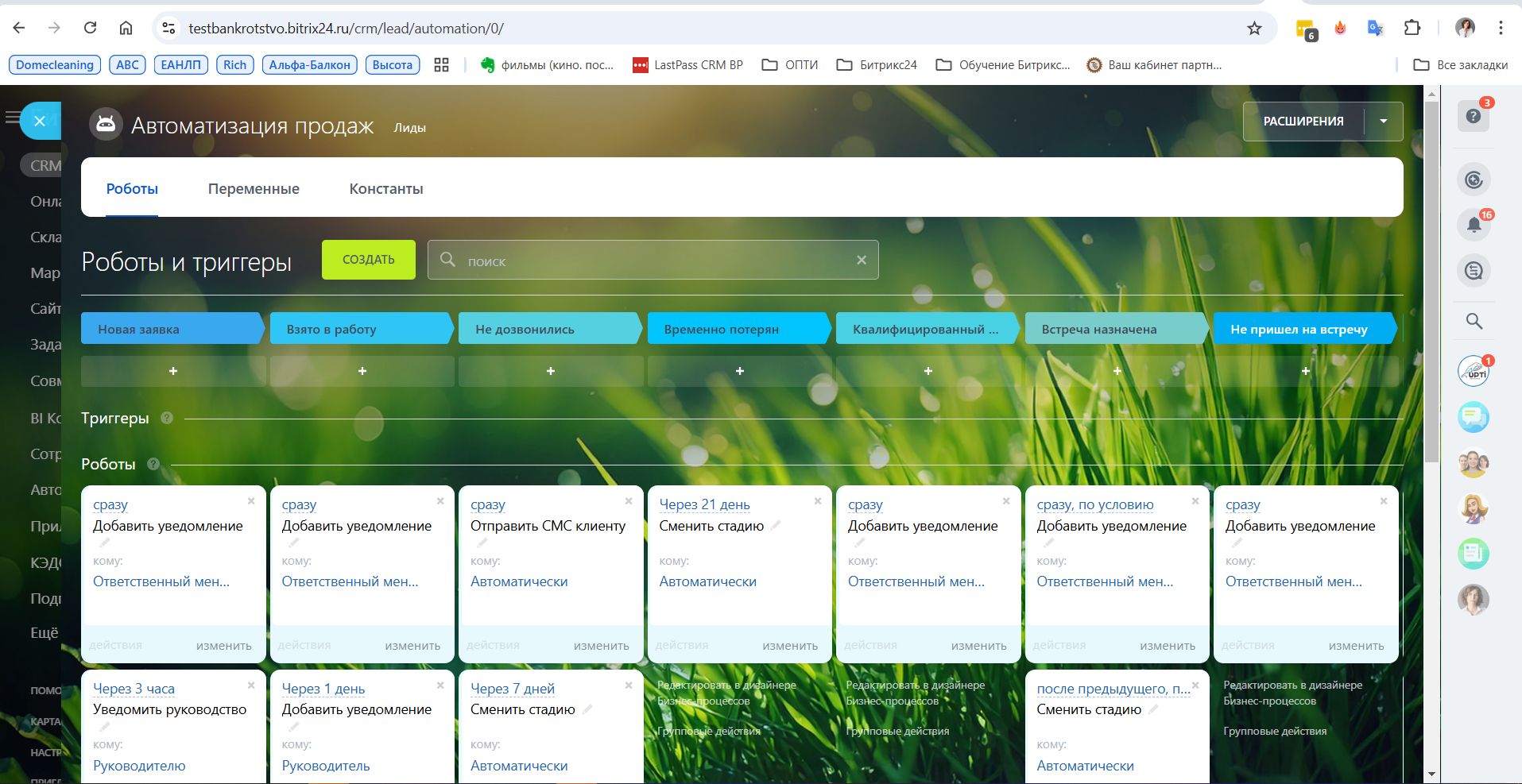В воронке лидов настроены автоматические действия, которые не позволят менеджеру забыть о действиях для достижения результата, а руководителю – видеть, что на ключевых этапах ЛИД или Сделка находятся дольше установленного времени.