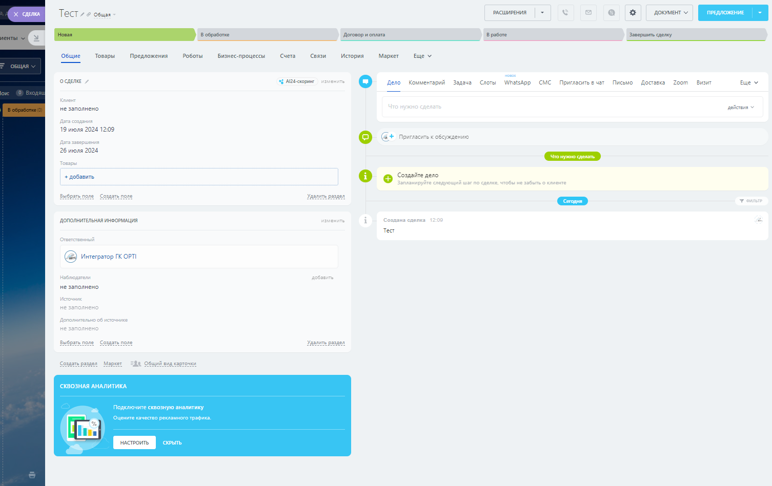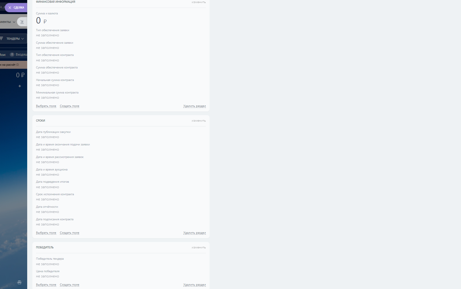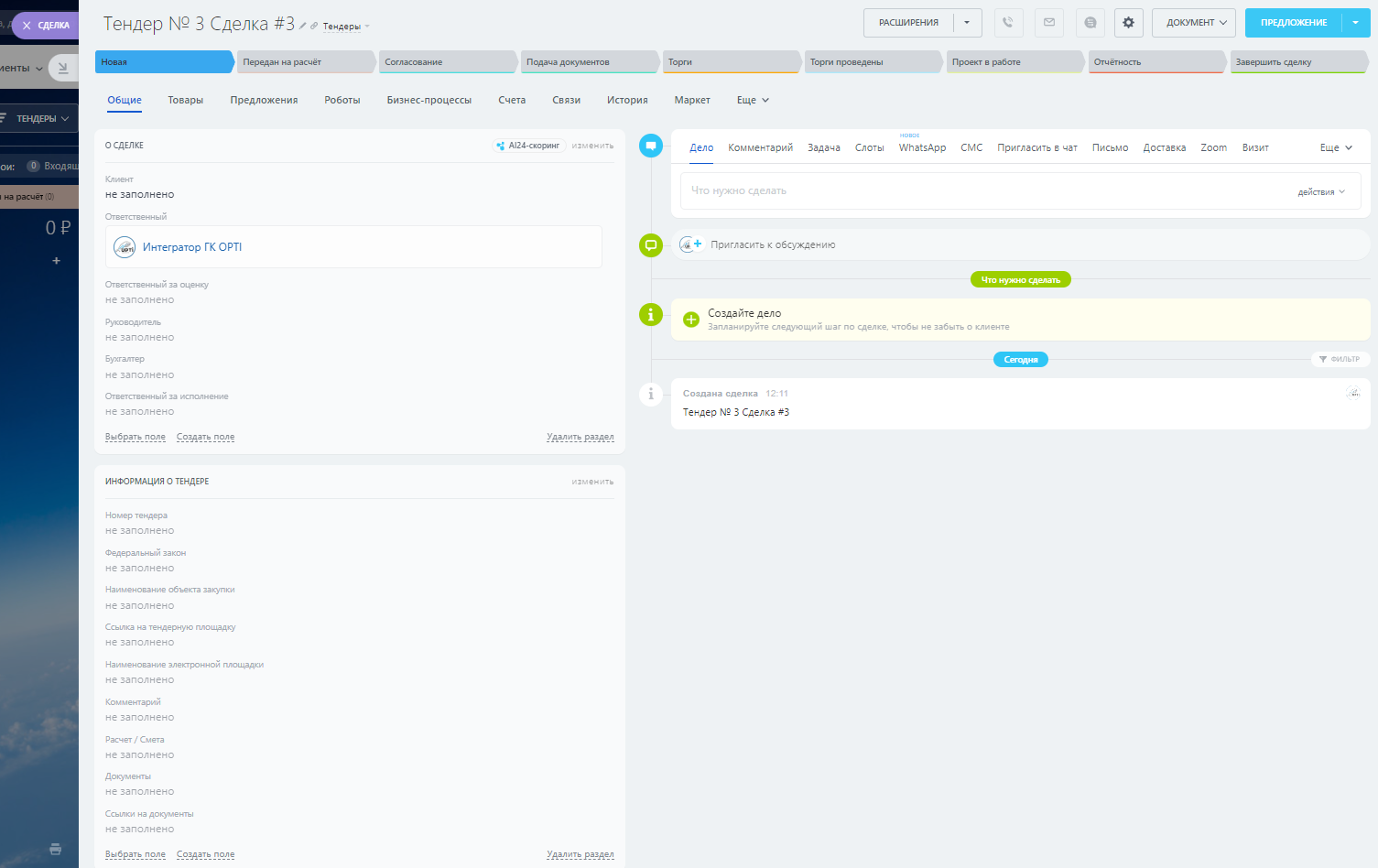 Карточка Сделки полностью настроена понятно и удобно, сохранили только нужные поля для работы с Тендерами.