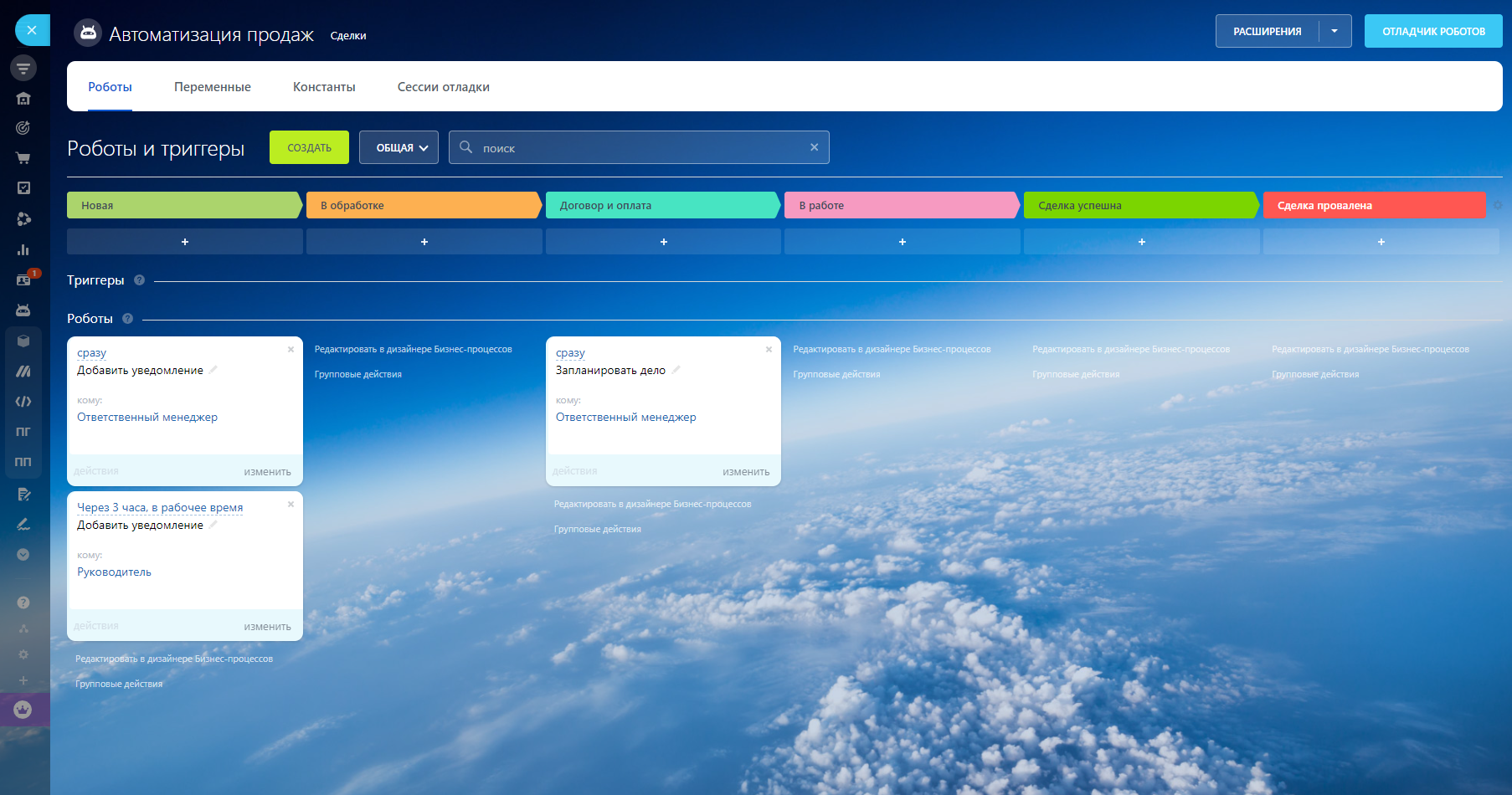 Также настроены уведомления руководителю при закрытии Сделки в проигрышные стадии.