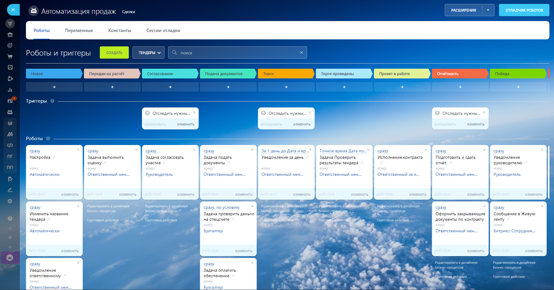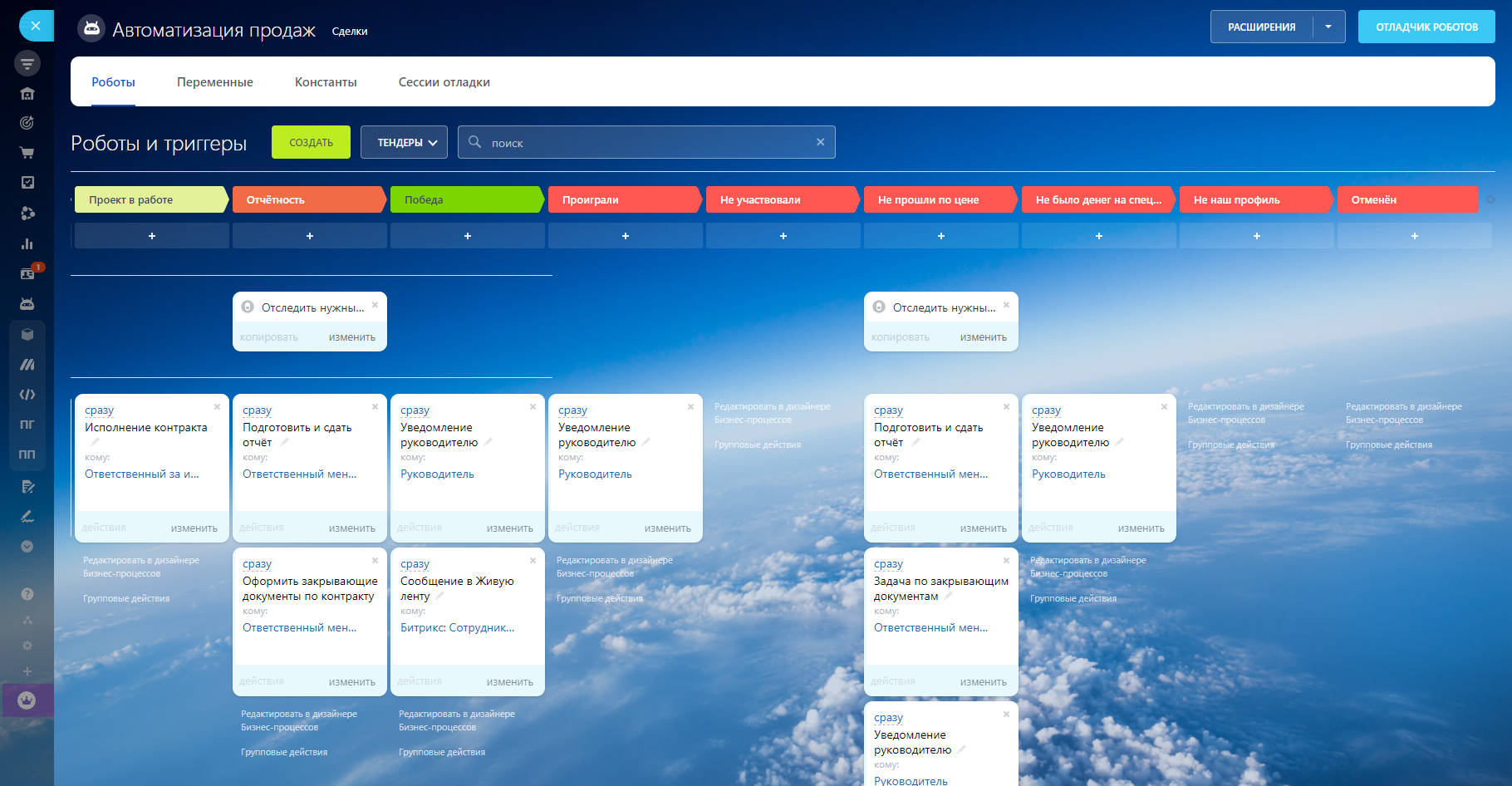 Победа - участие в тендере завершилось победой. Руководитель получает соответствующее уведомление. Робот создает копию сделки в воронке "Исполнение контракта". Робот отправляет сообщение о победе в тендере всем сотрудникам в живую ленту.
