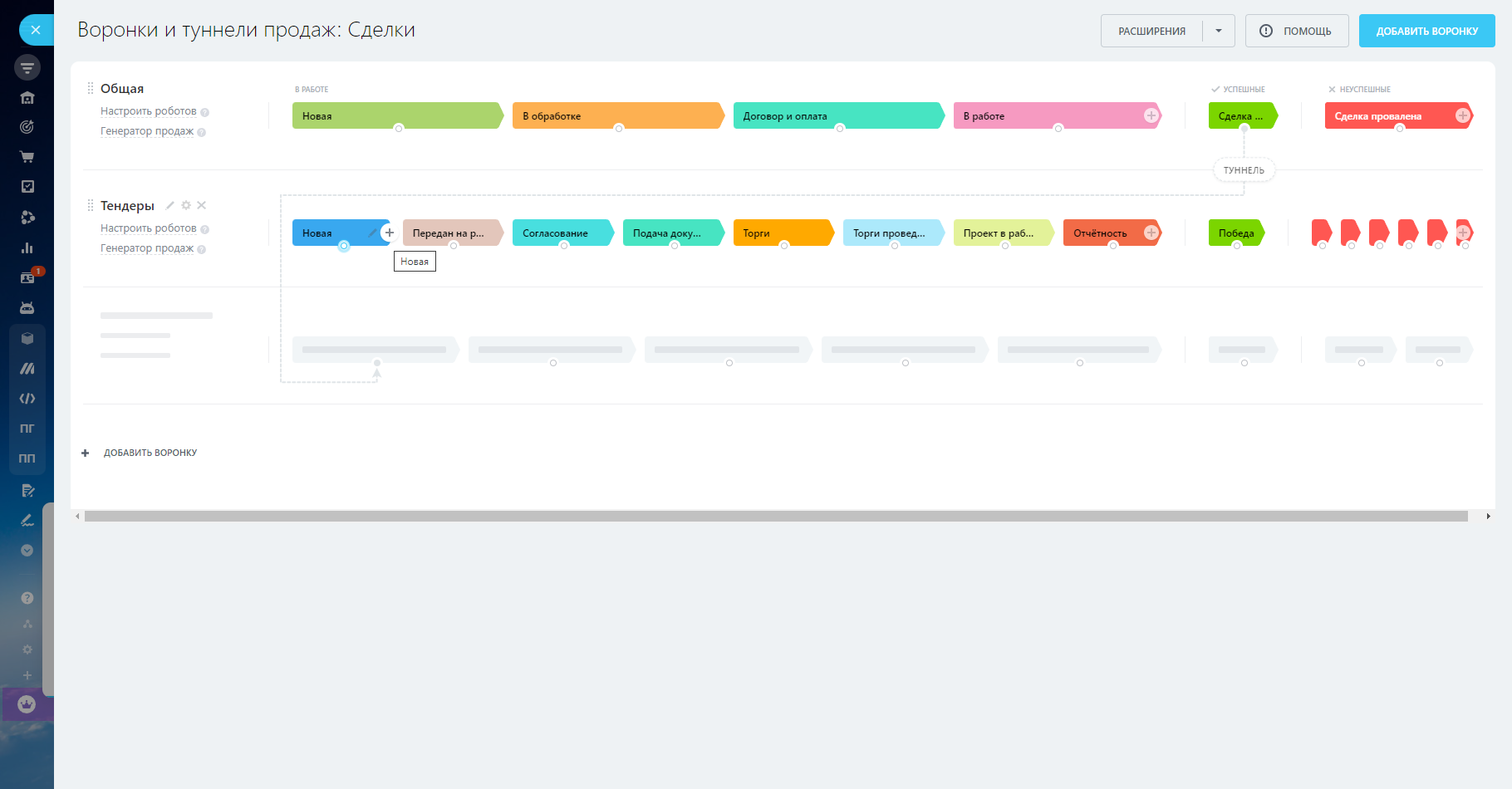 Новая - в CRM добавляется заявка на тендер. Добавляются ответственные за заявку, изменяется название сделки и отправляется уведомление ответственному о поступлении новой заявки. Необходимо заполнить обязательные поля на данной стадии для того, чтобы сменилась стадия.