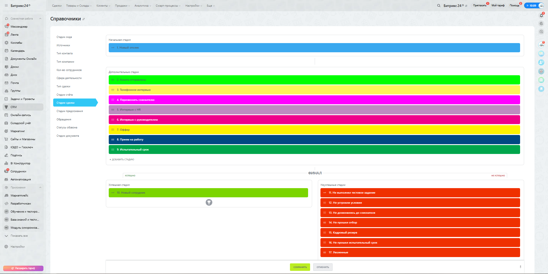 В CRM для HR сферы настроена 1 воронка сделок:ВОРОНКА ПОДБОР ПЕРСОНАЛА