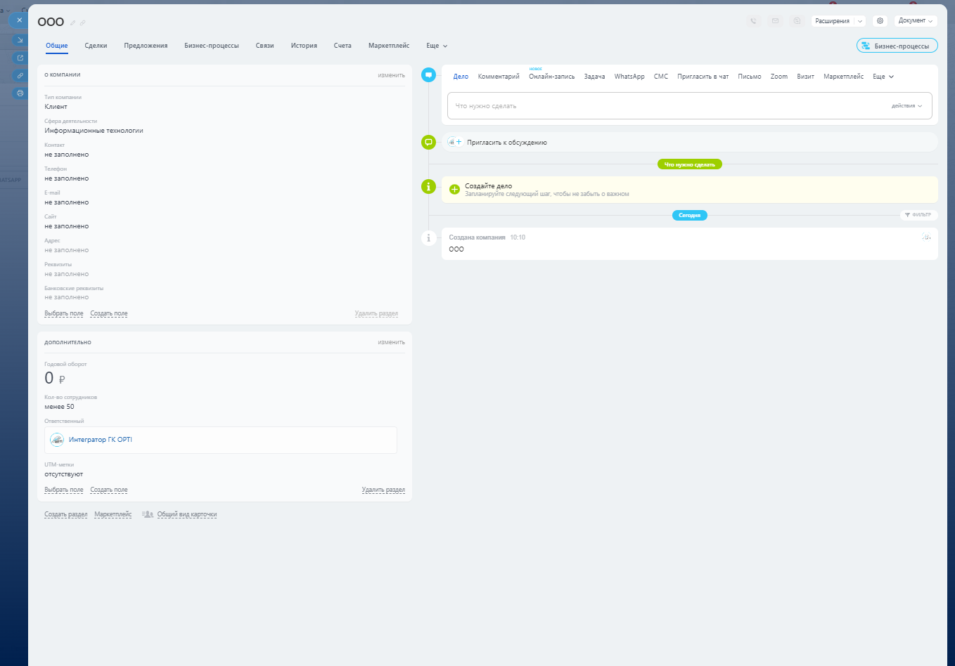 Для того, чтобы сохранять необходимую информацию, в отраслевую CRM в карточки контактов и сделок были добавлены пользовательские поля. А также установлена обязательность заполнения полей на определенных стадиях.