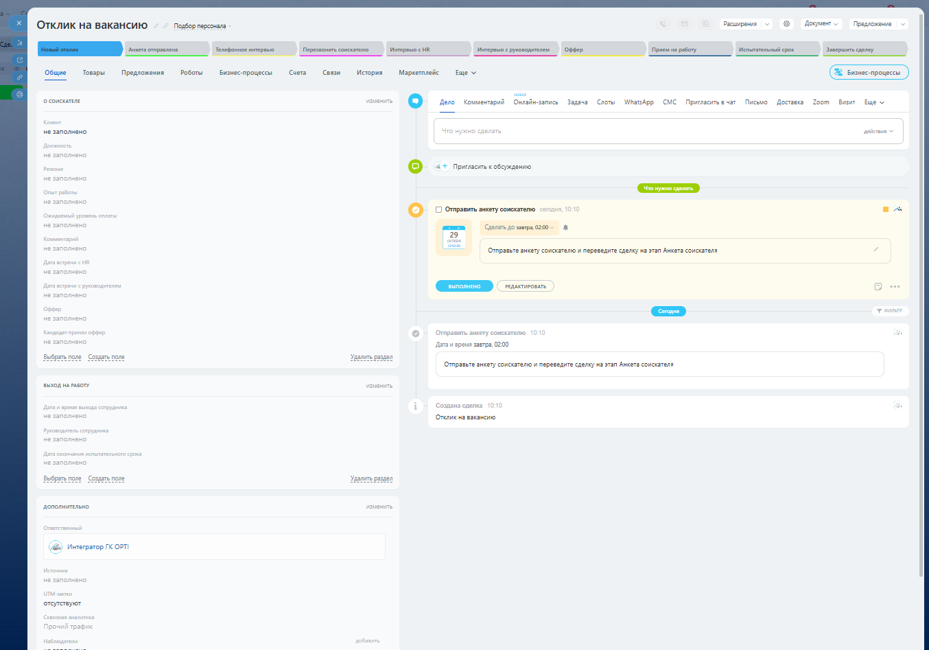 Автоматически ставится дело «Отправить анкету соискателю» и заполняется поле карточки контакта «Дата отклика». После отправки анкеты HR переводит сделку на стадия Анкета отправлена.