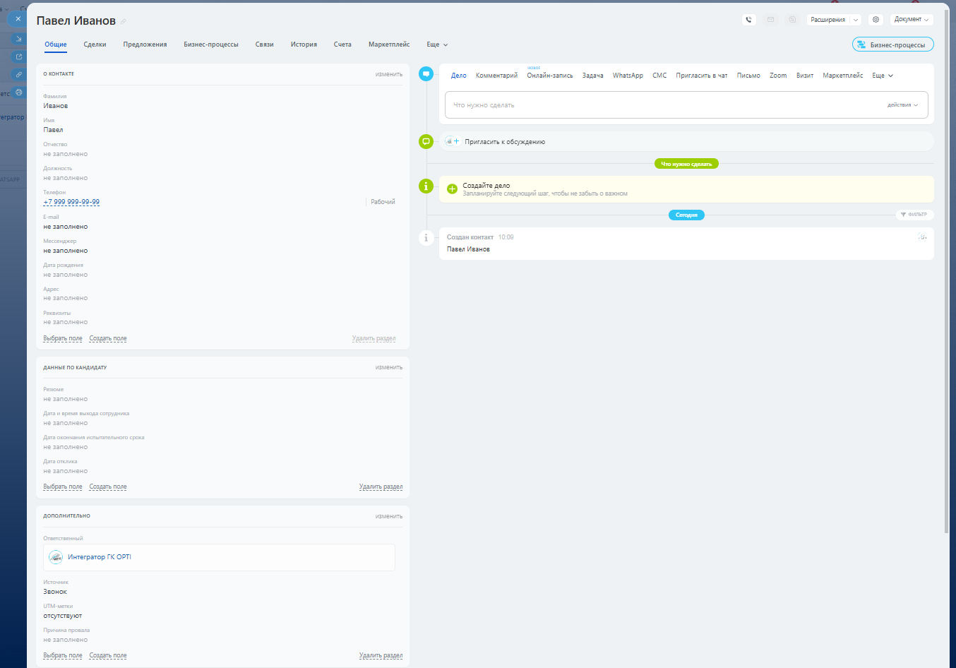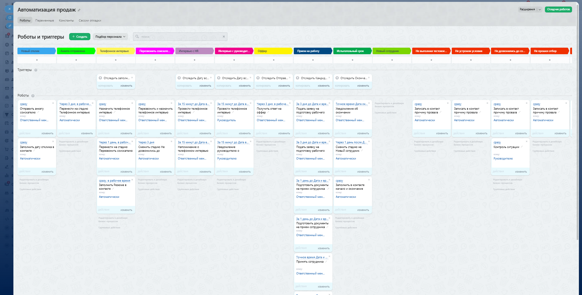 Автоматически ставится дело «Назначить телефонное интервью». Через 1 день после перехода сделки на стадию «Телефонное интервью» она автоматически перемещается на стадию «Перезвонить соискателю».