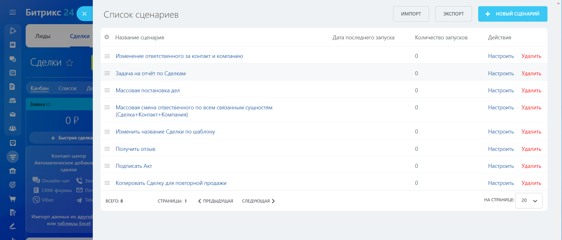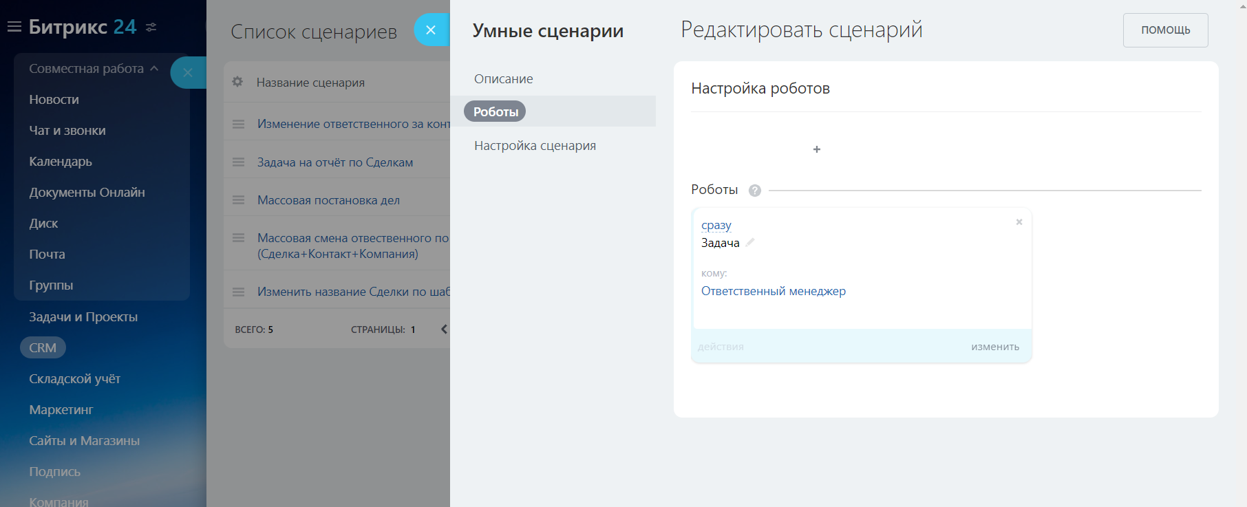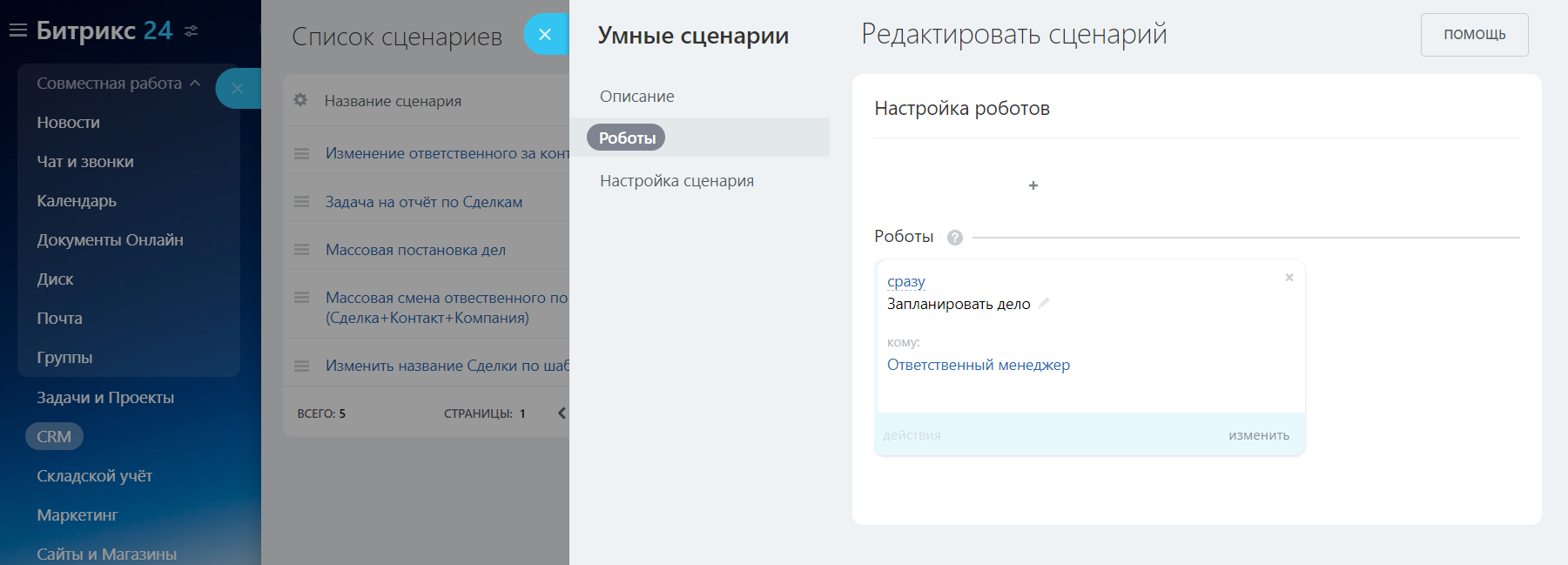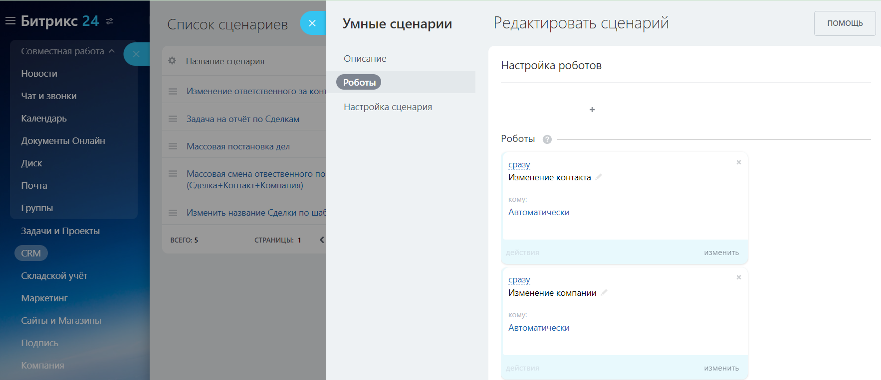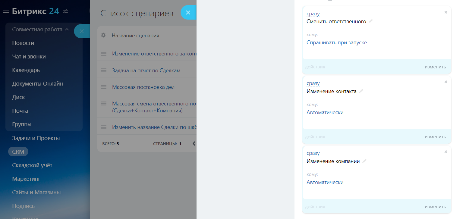- В Сделках будет изменён ответственный. В карточке Контакта и Компании ответственный заменится тоже (и будет совпадать с ответственным у сделки)