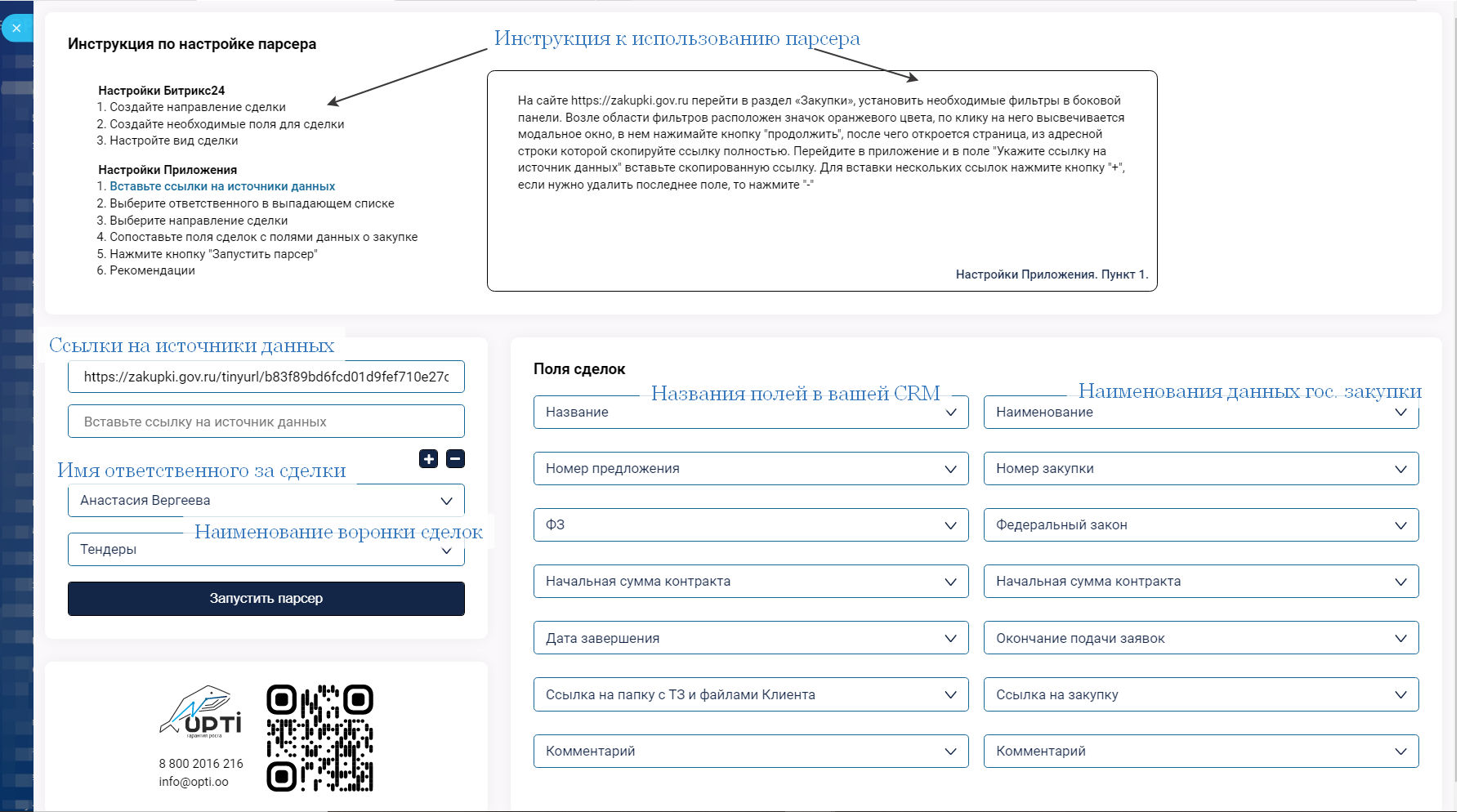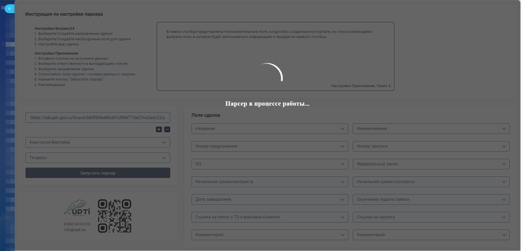 По подписке в приложении установлен лимит на добавление сделок - до трехсот сделок в месяц, если необходимо большее количество или индивидуальное решение для парсинга данных с сайта государственных закупок, напишите нам на почту b24@opti.ooo или в открытые линии.