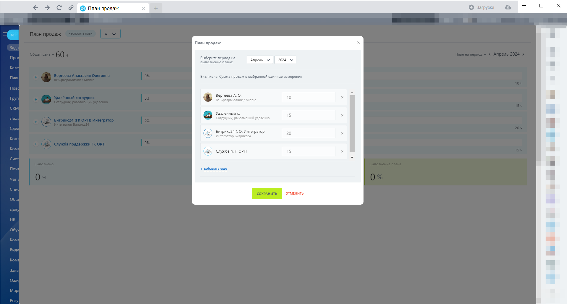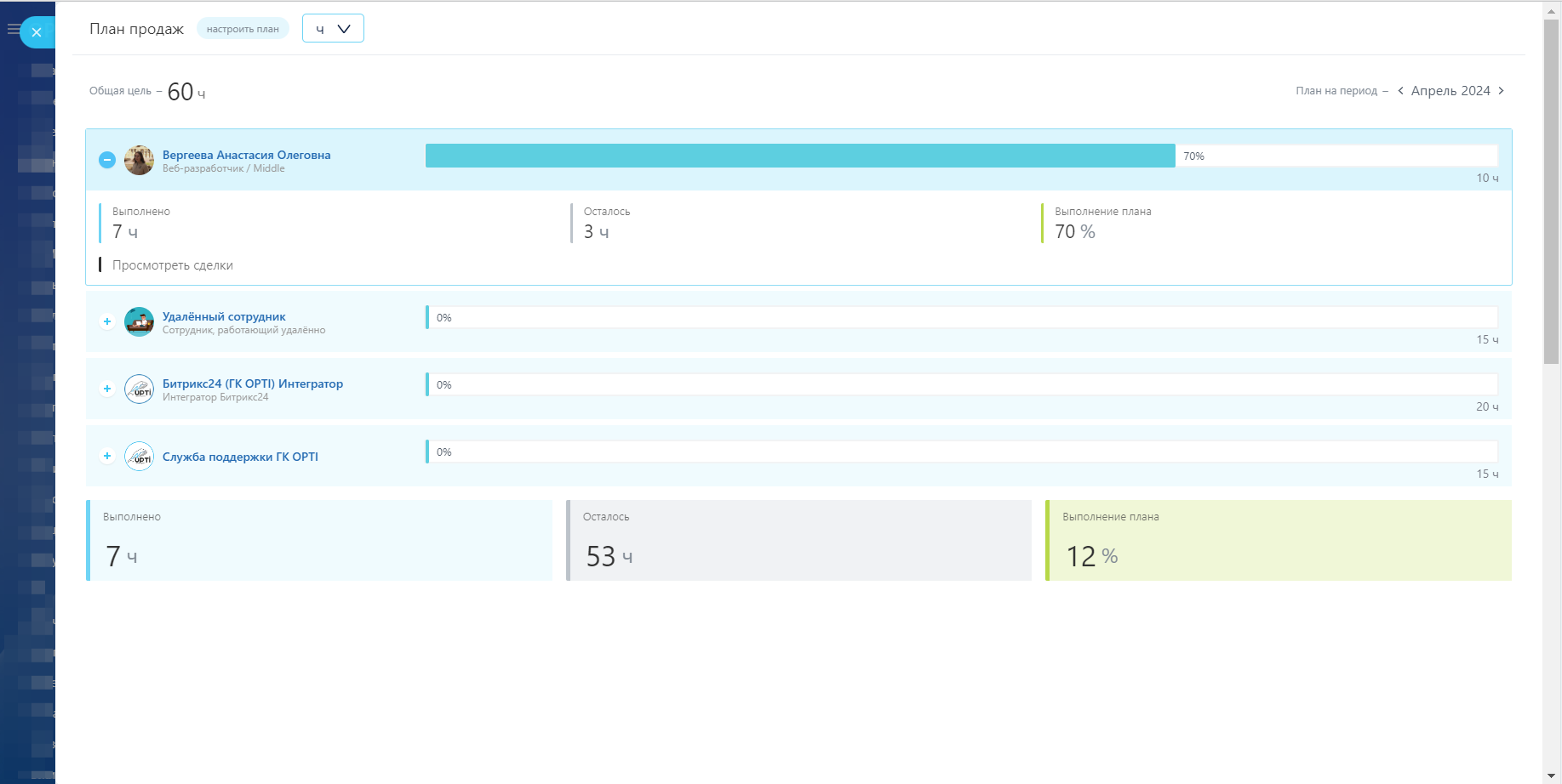 Перед началом работы для просмотра отчета необходимо составить план для выбранных вами сотрудников, нажав на кнопку «Настроить план», выбрать единицу измерения вы можете в выпадающем списке рядом с кнопкой.