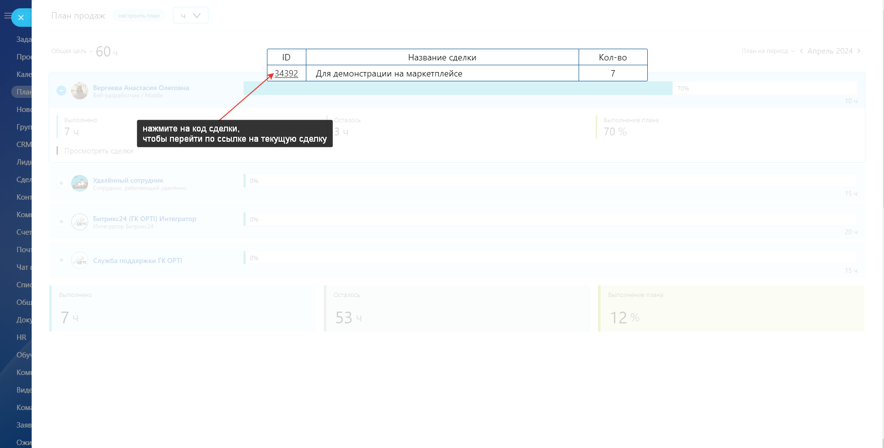 Приложение позволяет редактировать план, удалять из него сотрудников или наоборот добавлять; устанавливать или менять цели на месяц. Для вашего удобства реализован поиск по имени сотрудников для упрощения работы с составлением плана. Также имеется возможность посмотреть список сделок, которые успешно закрыл сотрудник в выбранном месяце, отображается код сделки (в нем зашита ссылка на саму сделку), наименование сделки и общее количество по сделке в выбранных единицах измерения. Считаются товарные позиции сделки во вкладке «товары» в выбранной единице измерения.