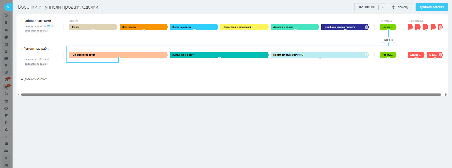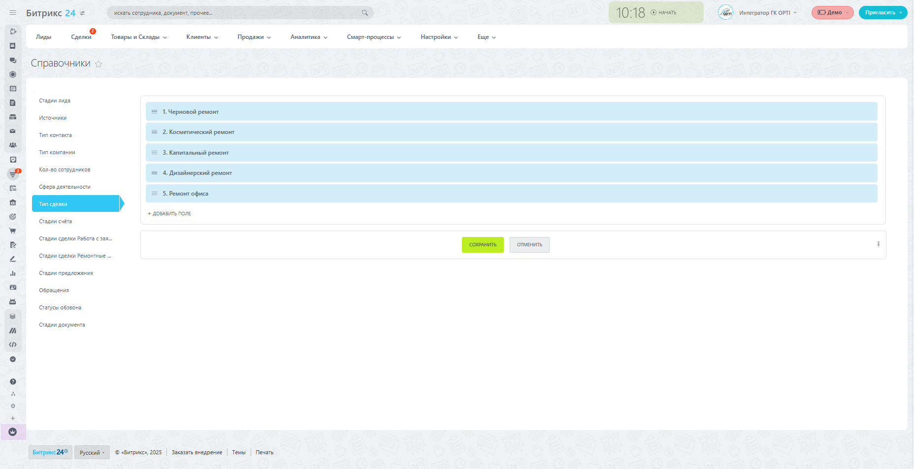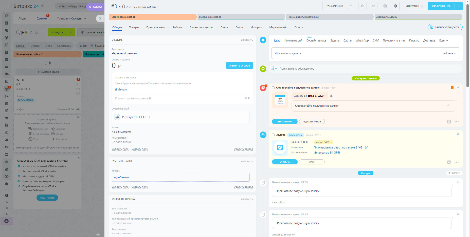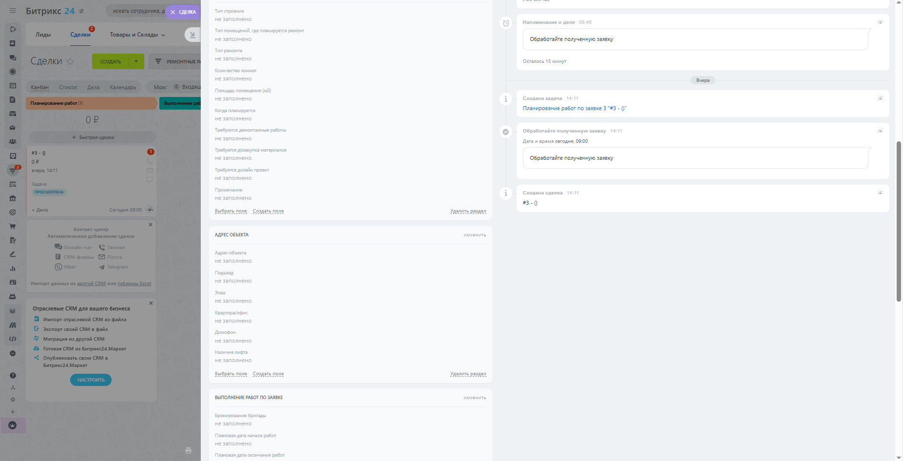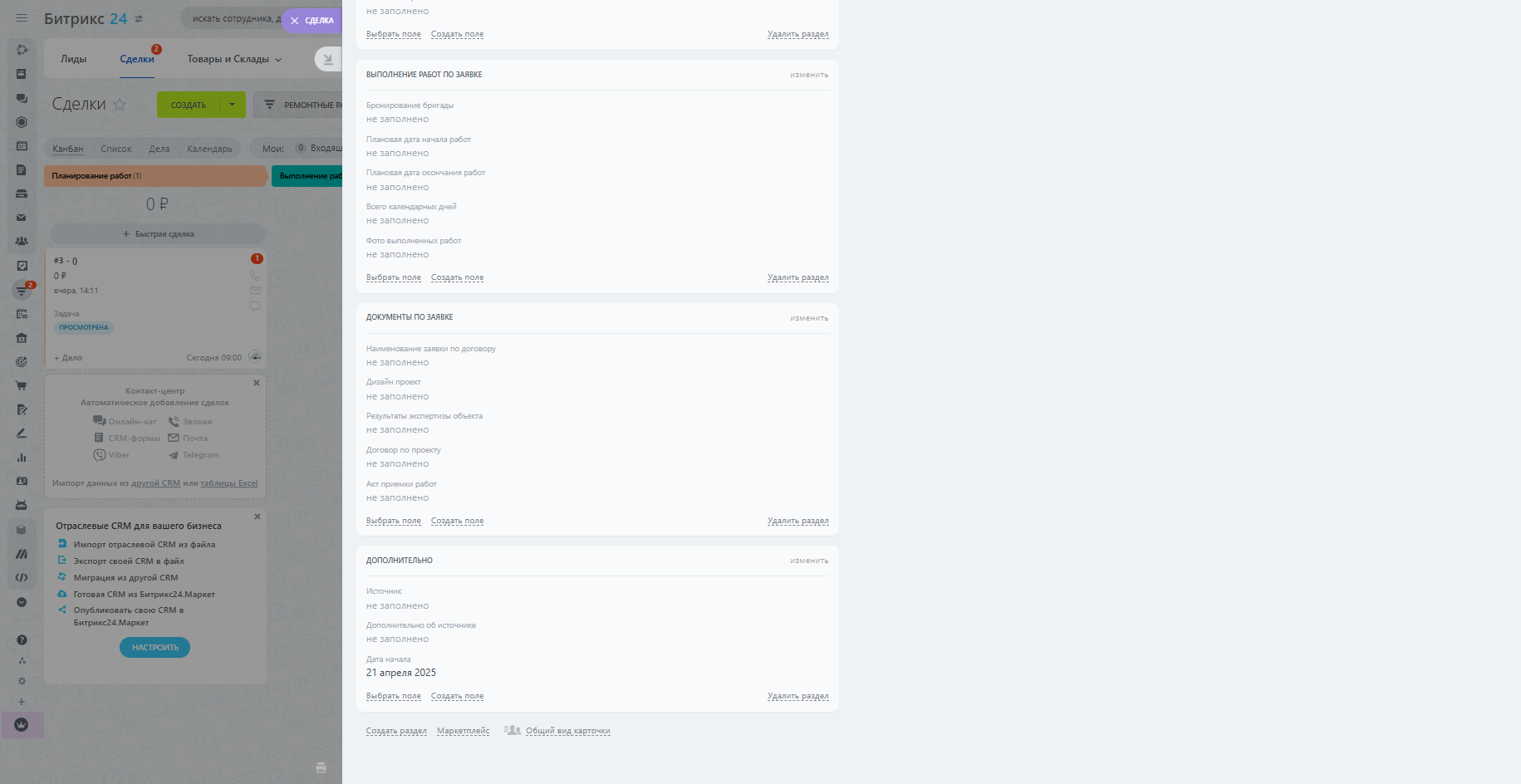 Добавлены дополнительные поля в Сделках: Адрес объекта;Требуется выезд на объект?;Стоимость проекта;Дизайн проект;Договор по проекту;Дата заключения договора;Закрывающие документы;Вид работы;Сотрудник на выезд;Фото выполненных работ;Требуется дозакупка материалов;Требуются демонтажные работы;Счет по предоплате;Подъезд;Этаж;Квартира/офис;Домофон;Наличие лифта;Плановая дата начала работ;Плановая дата окончания работ;Всего календарных дней;Результаты экспертизы объекта;Бронирование бригады;Тип строения;Тип ремонта;Количество комнат;Требуется дизайн проект;Площадь помещения (м2);Когда планируется;Акт приемки работ;Наименование заявки по договору;Тип помещений, где планируется ремонт;Примечание;Осталось оплатить;Предоплата;Проверка остатка оплаты