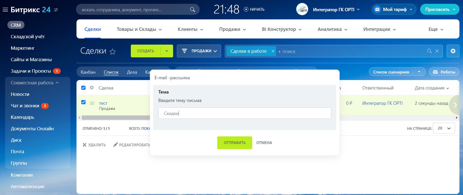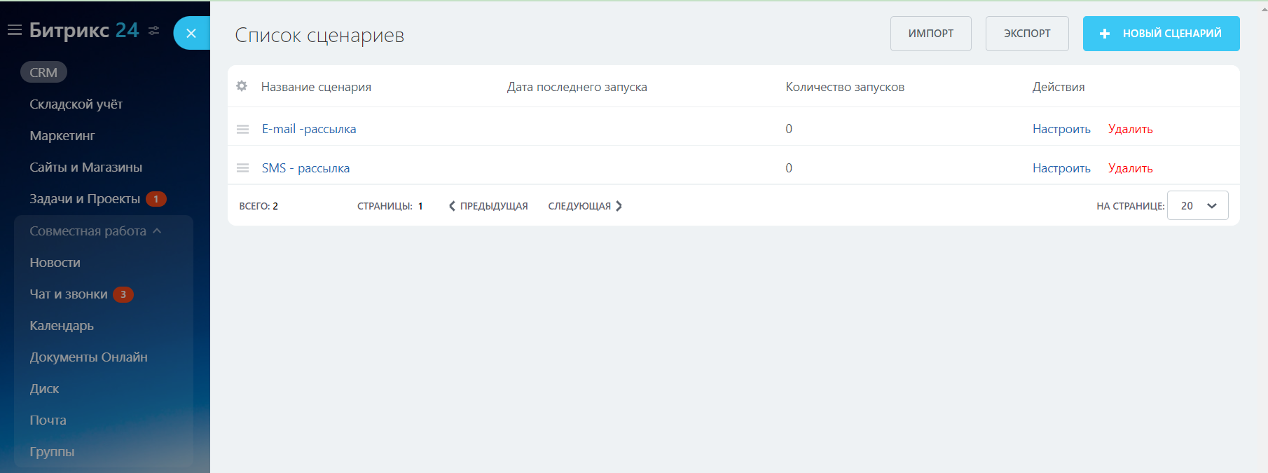 Мы создали 2 умных сценария, с помощью которых можно запустить рассылку по выбранным Сделкам. !Для отправки SMS требуется дополнительно подключить SMS-провайдера!