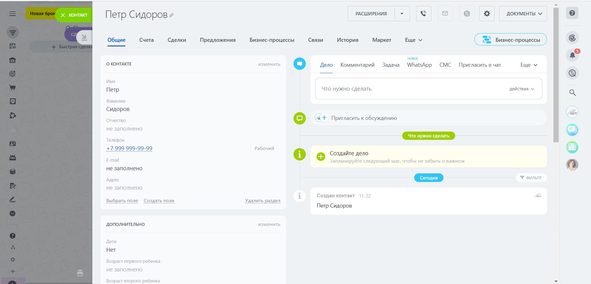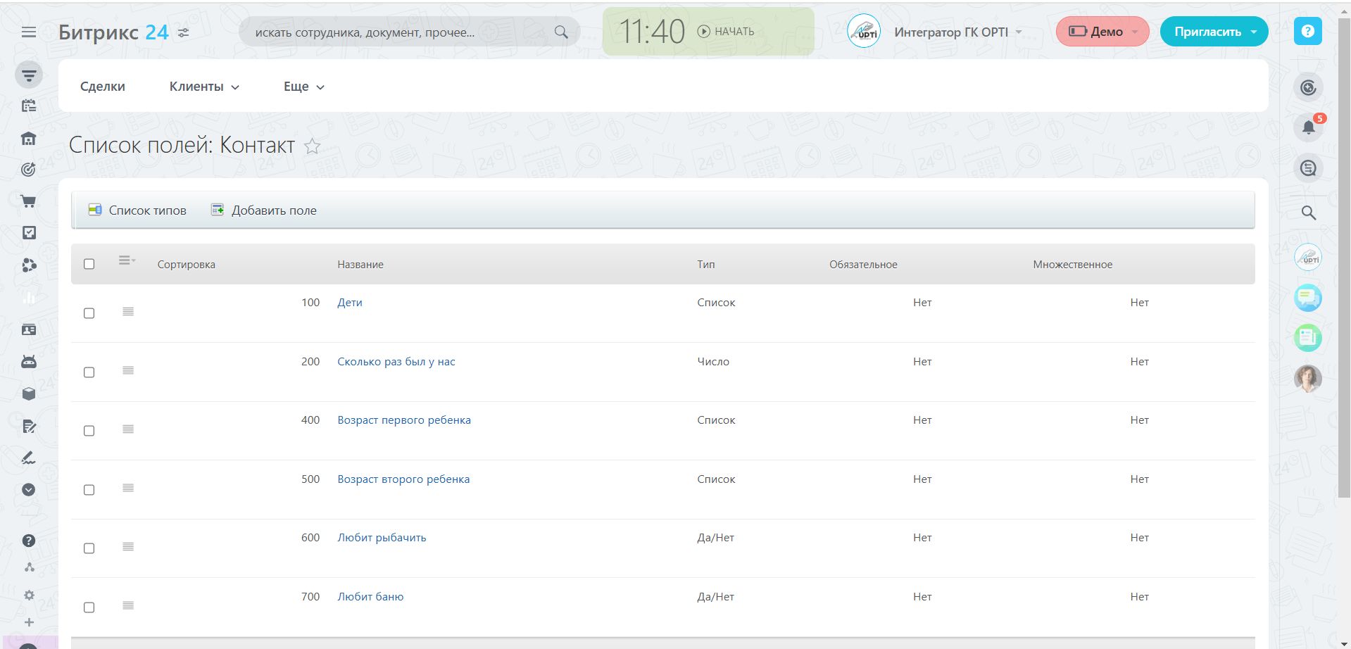 Добавили пользовательские поля в карточку контакта: Количество детей, Возраст первого ребенка, Возраст второго ребенка, Любит рыбалку, Любит баню