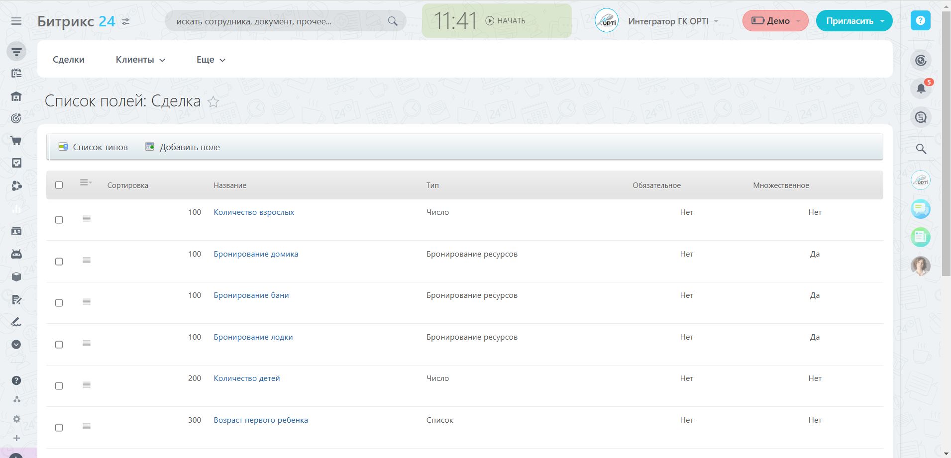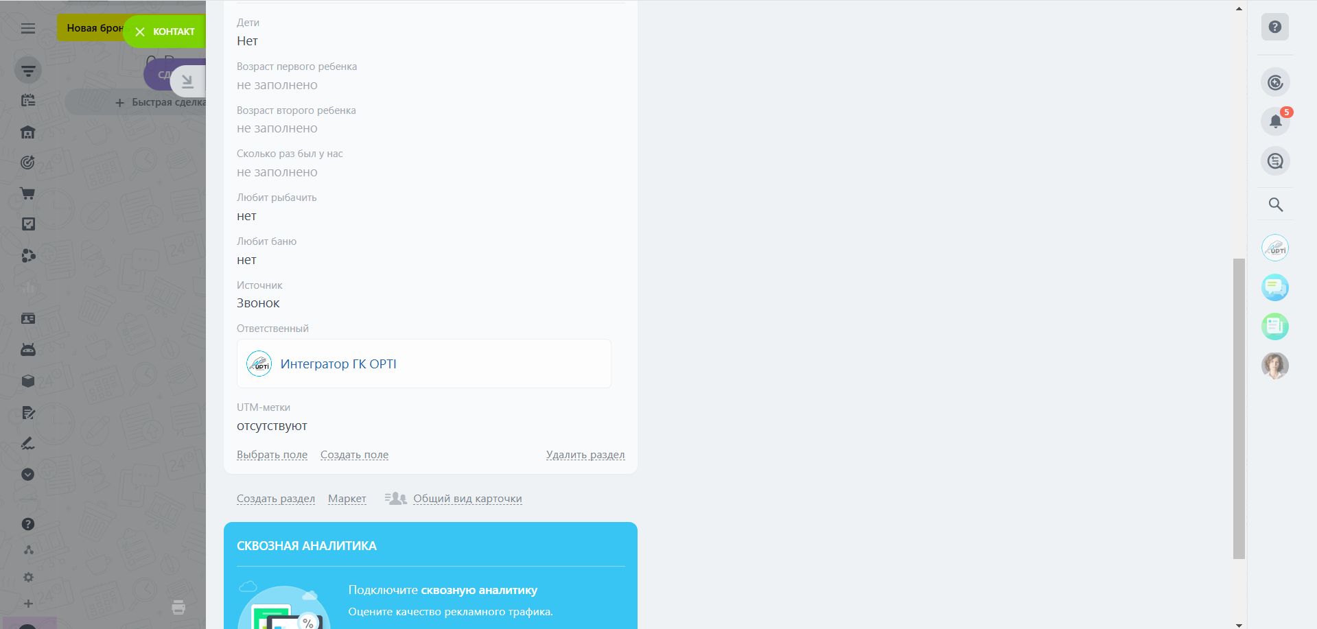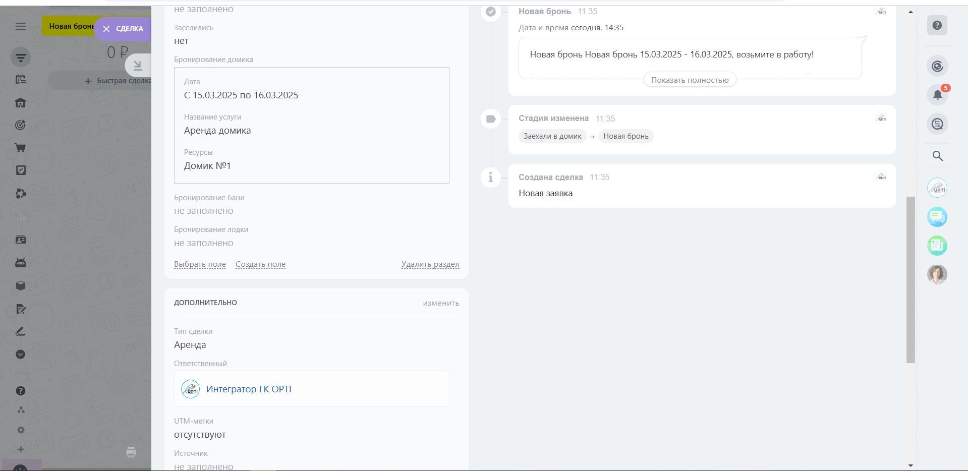 Добавили пользовательские поля в карточку сделки: Количество взрослых, Количество детей, Возраст первого ребенка, Возраст второго ребенка, Бронирование домика, Бронирование бани, Бронирование лодки, Дата заселения, Дата выезда.