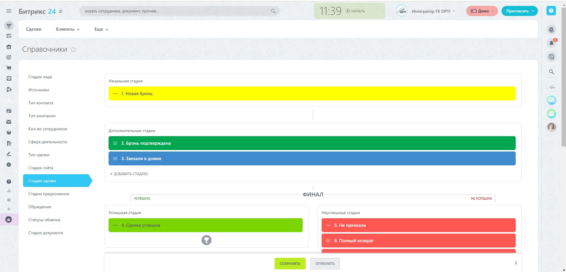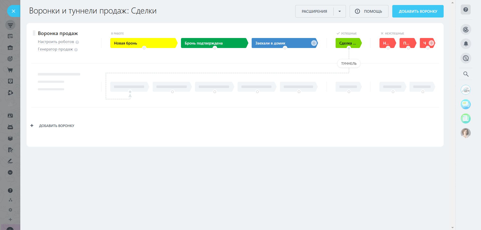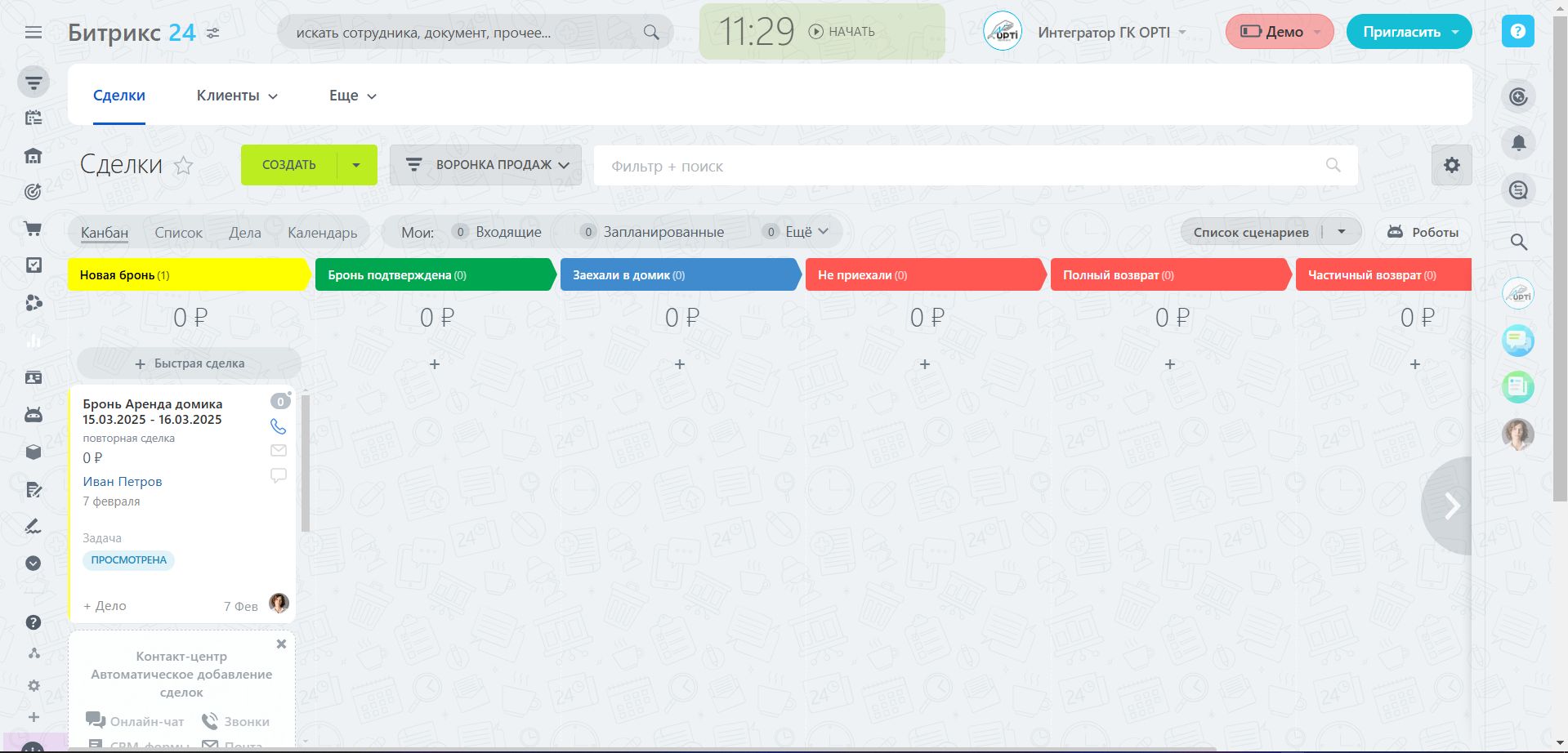В CRM для Турбазы настроены стадии сделок, карточки сделок и контактов для того, чтобы вам было проще разобраться в системе.