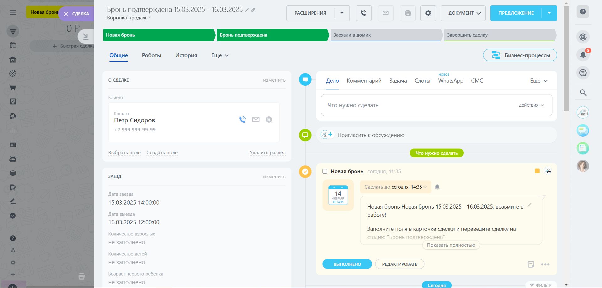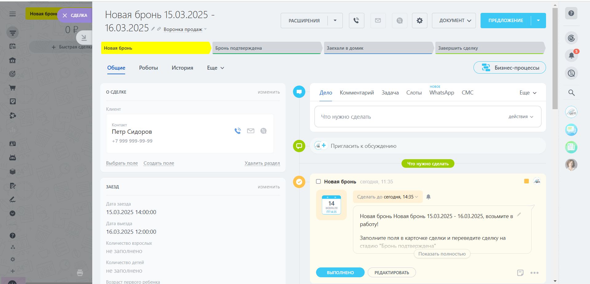 • робот, который уведомит менеджера о новой брони и поставит дело в карточке сделки «Новая бронь».