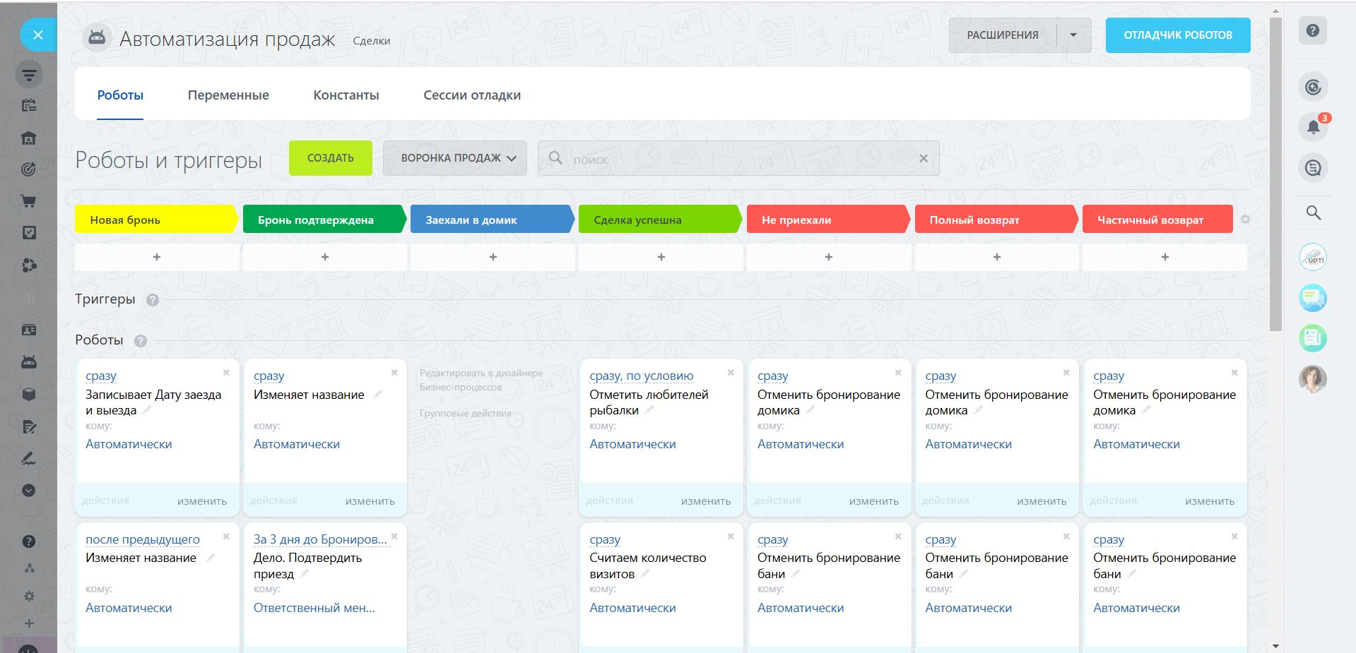 • робот, который меняет название сделки на «Бронь подтверждена» и добавляет к названию даты заезда и выезда для наглядного отображения подтвержденных броней.