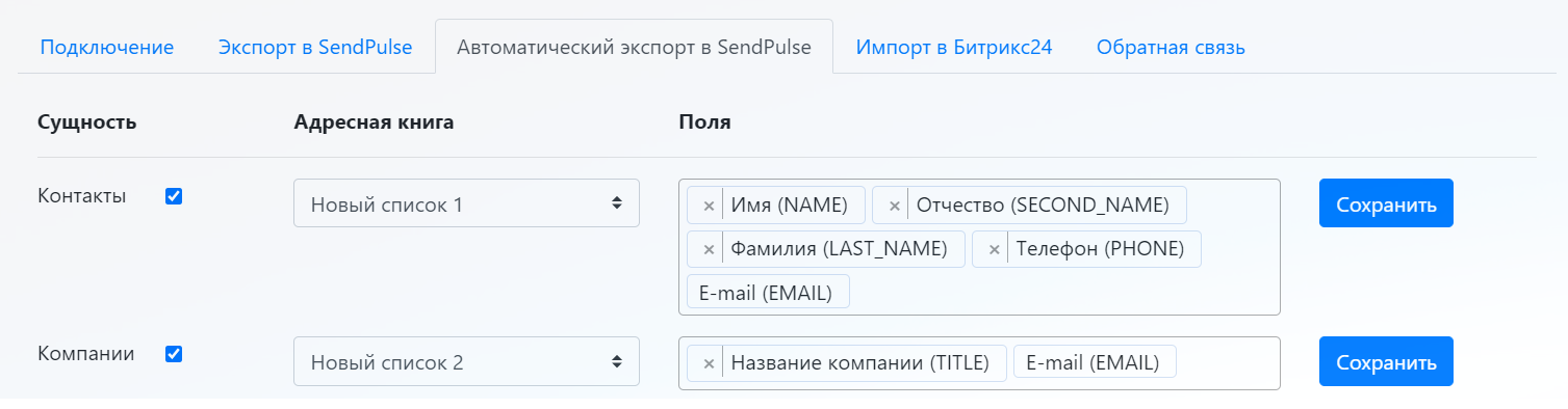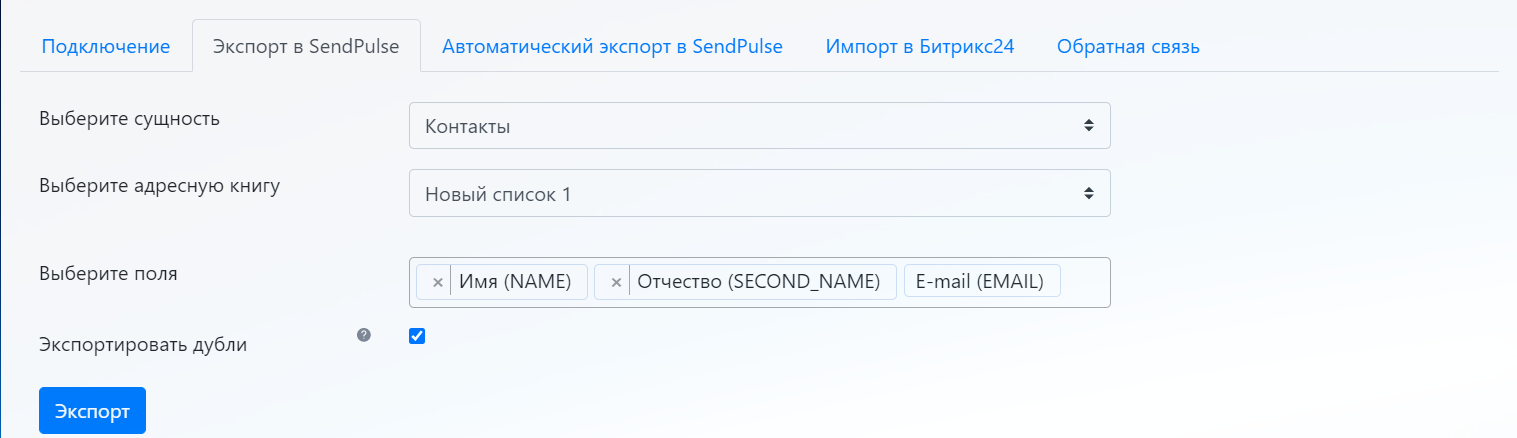 1. Экспорт контактов или компаний из Битрикс24 в адресные книги SendPulse. Во время экспорта в SendPulse передаются новые записи и обновляются существующие. На вкладке экспорта можно выбрать экспортируемые поля в SendPulse, если выбранных полей не существует в SendPulse, то они создадутся автоматически. Также на вкладке экспорта имеется возможность отключить экспортирование записей, у которых имеются дубли по e-mail в Битрикс24.