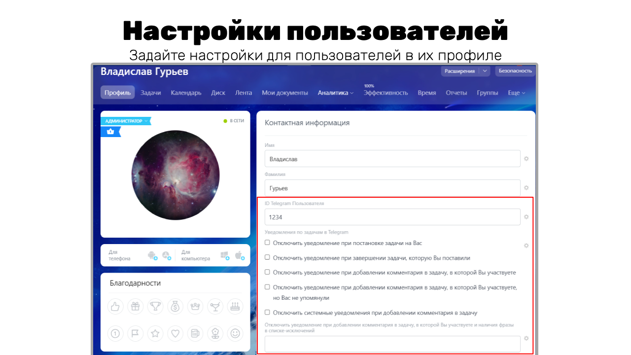 • Каждый сотрудник указывает свой ID Telegram Пользователя в профиле Битрикс24