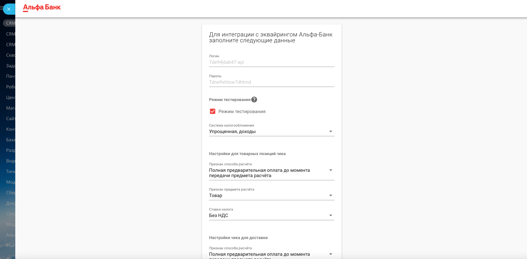 Поддержка 54-ФЗИнтеграция соответствует требованиям 54-ФЗ. Для этого в процессе интеграции необходимо из выпадающих списков выбрать систему налогообложения и прочие параметры необходимые для формирования чека.