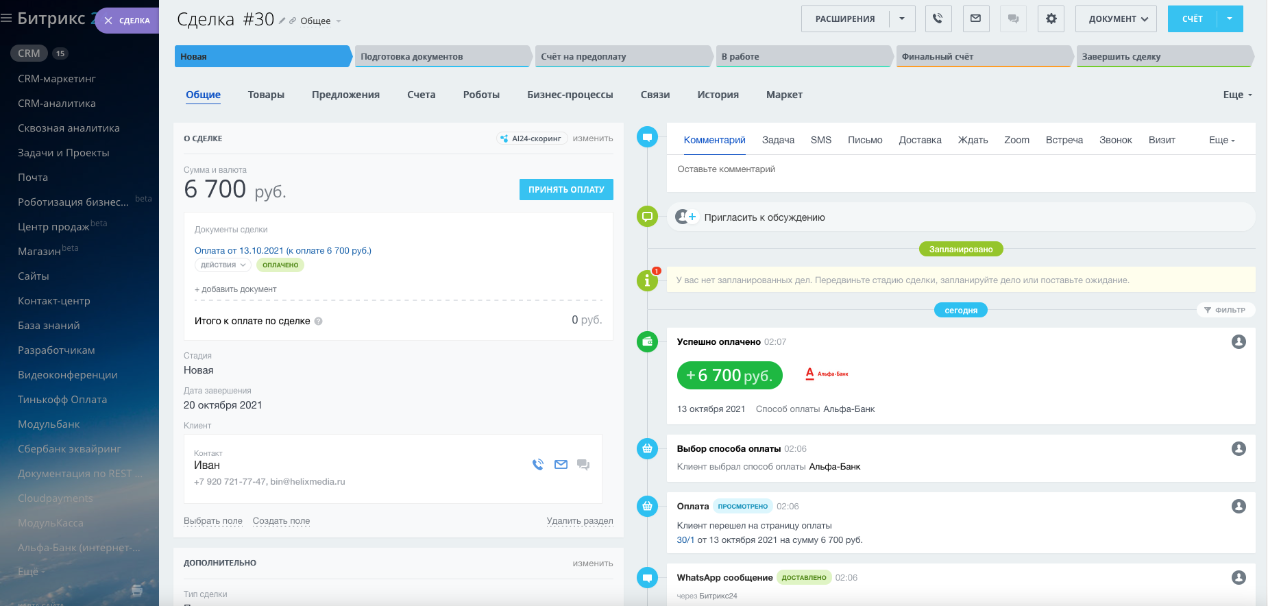 - Всегда актуальное состояние платежа в Timeline сделки или заказа.