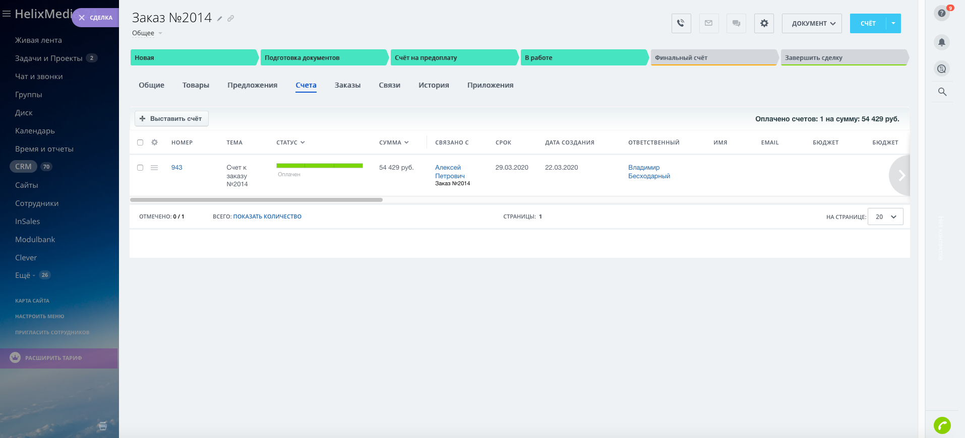 - Если заказ в магазине оплачен, счёт автоматически сменит статус на «Оплачено».