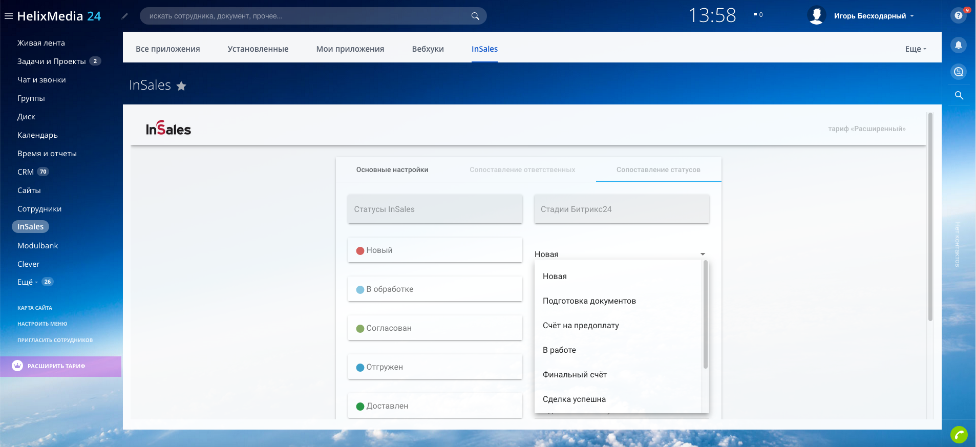- Аналогично настройкам пользователей, на данном тарифе доступно сопоставление статусов или стадий Битрикс24 с статусами из InSales. На основе сопоставления будет происходить перемещение сделки или лида по воронке продаж Битрикс24.
