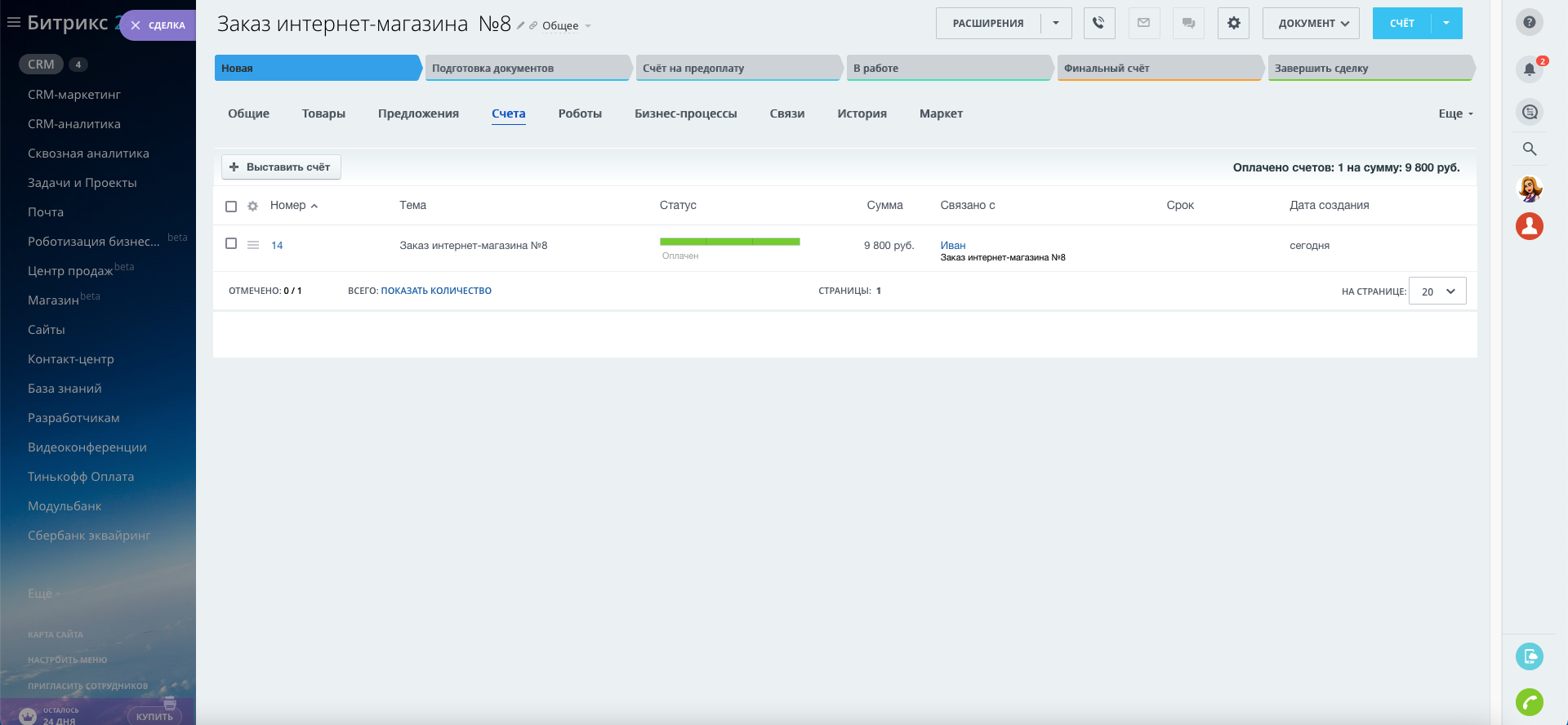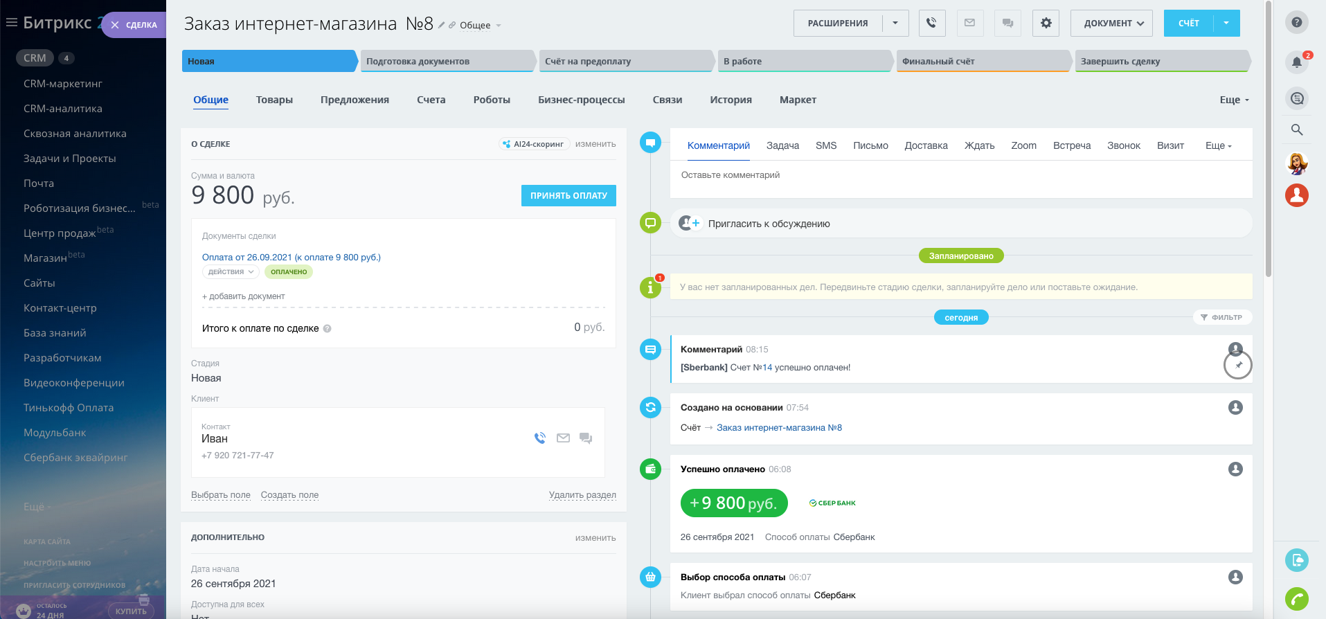 - Всегда актуальное состояние платежа в Timeline сделки или заказа.