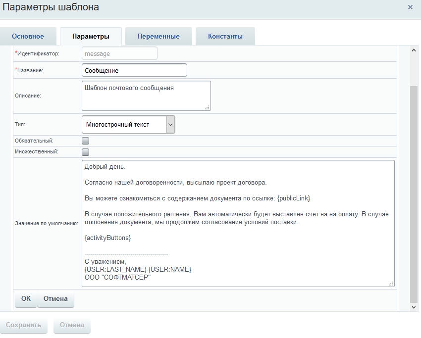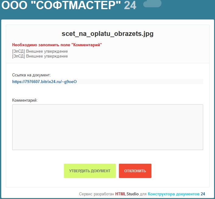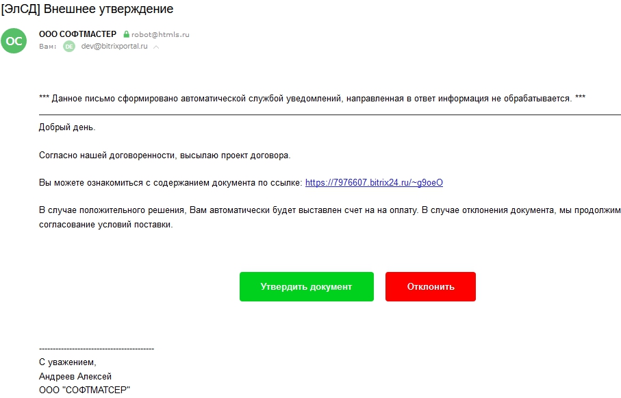 Модуль предназначен для согласование документов с внешними пользователями с помощью бизнес-процессов. Вы можете в автоматическом режиме формировать письмо и отправлять документ на согласование внешним пользователям. Согласование происходит через специальную форму.