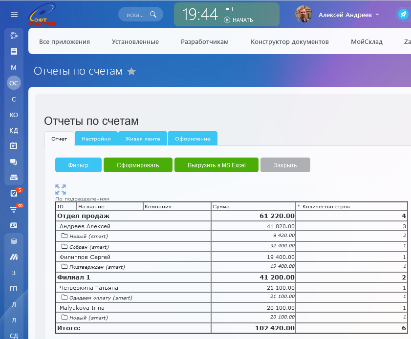 Универсальный конструктор отчетов по счетам. Выгрузка отчета в MS Excel.
