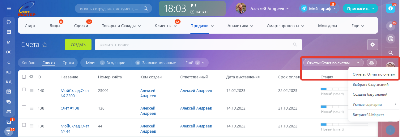 Быстро и просто увидеть: с какими счетами работает выбранный сотрудник по каждому направлению; с какими клиентами эти счета связаны; и в каких стадиях находятся счета в данный момент времени.