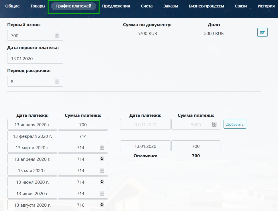 Вы просто указываете начальный платеж, количество месяцев рассрочки платежа и приложение автоматически рассчитает график оплат.