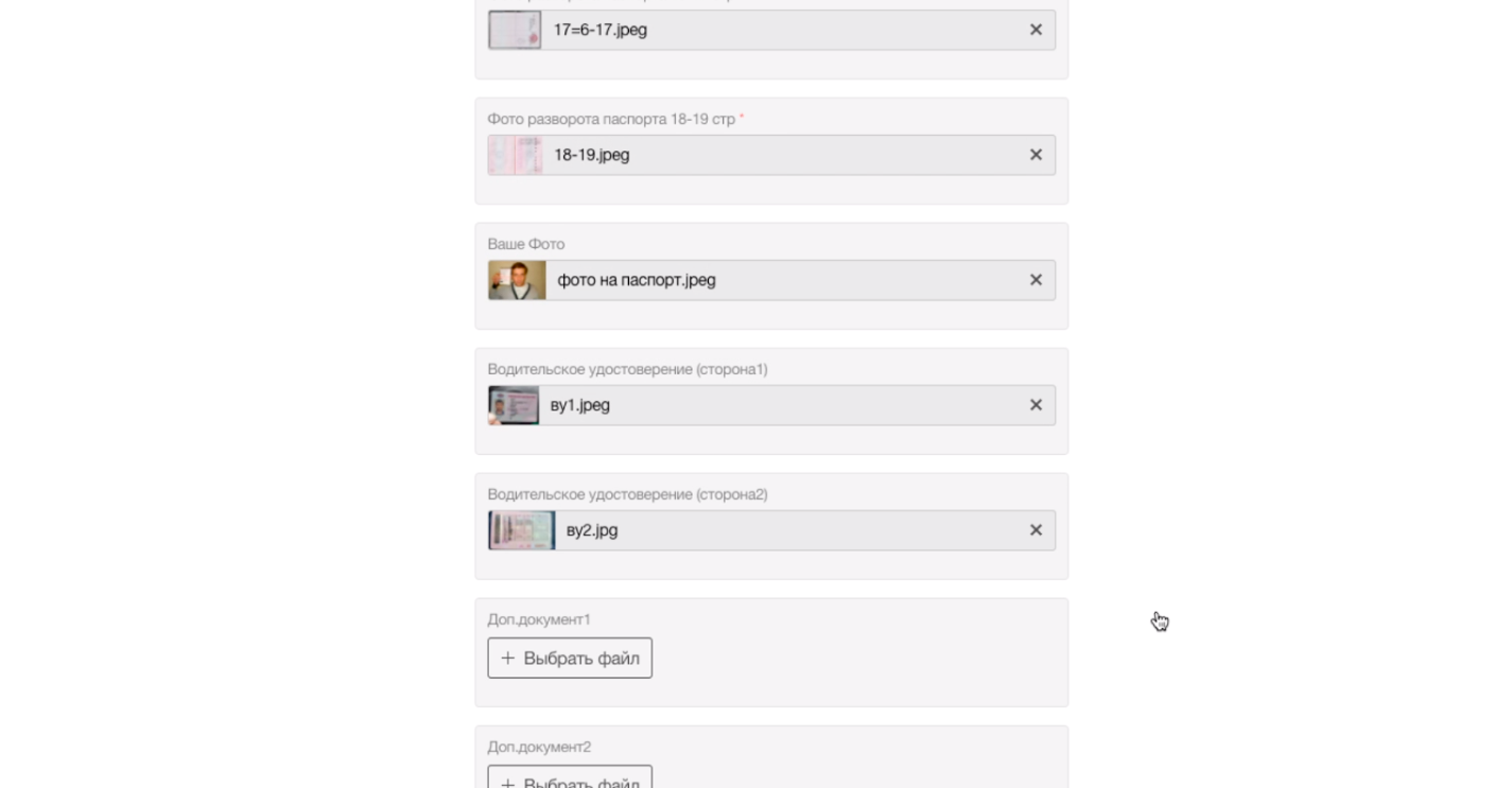 - Прикрепление документов заемщика (паспорт, фото, водительское удостоверение)