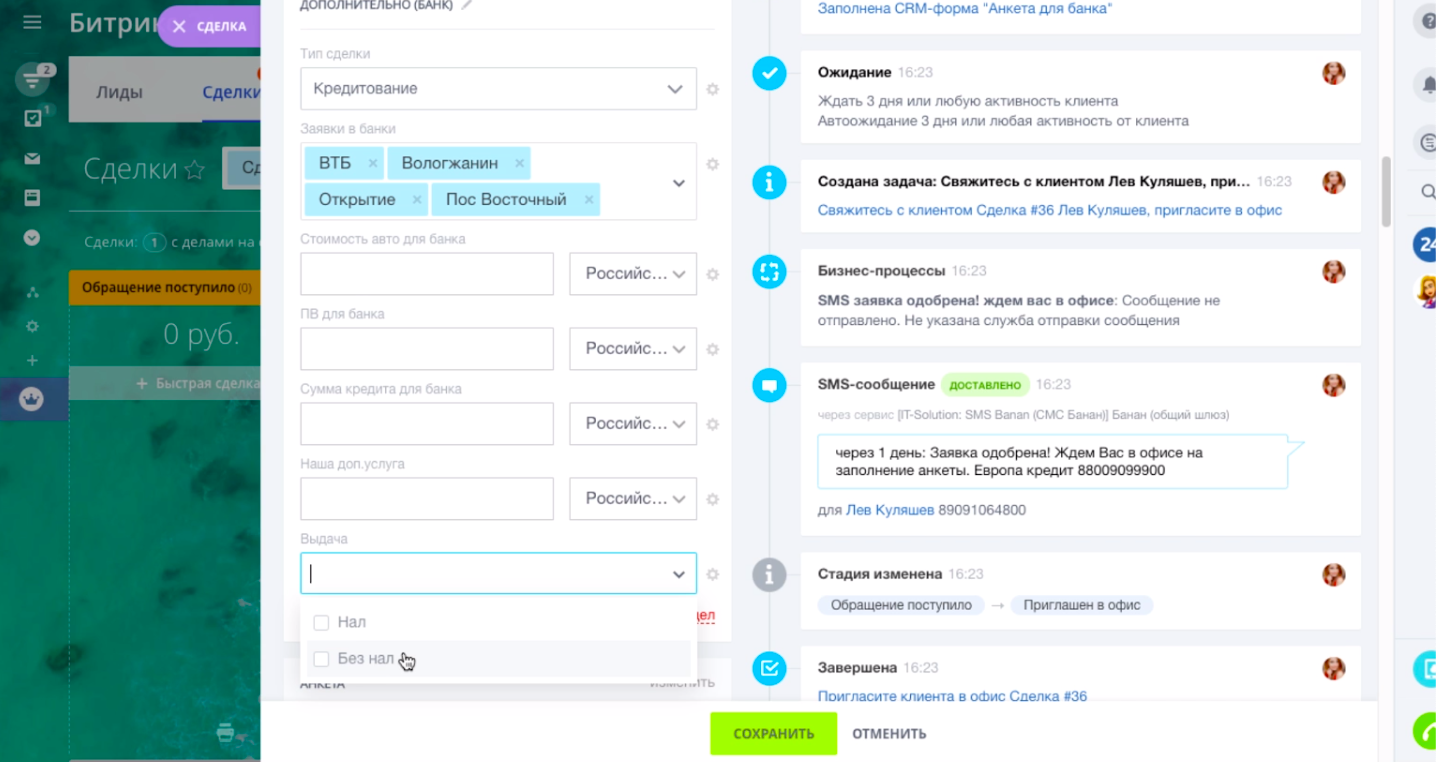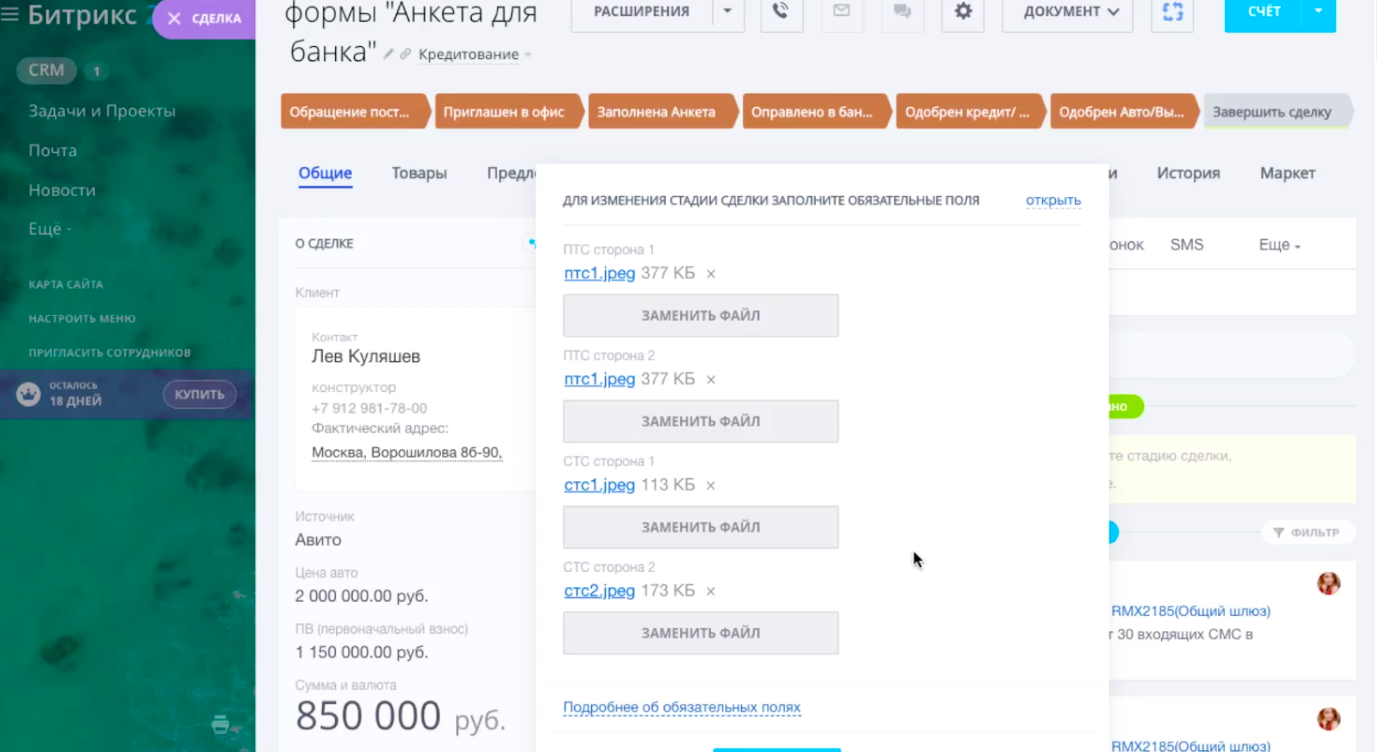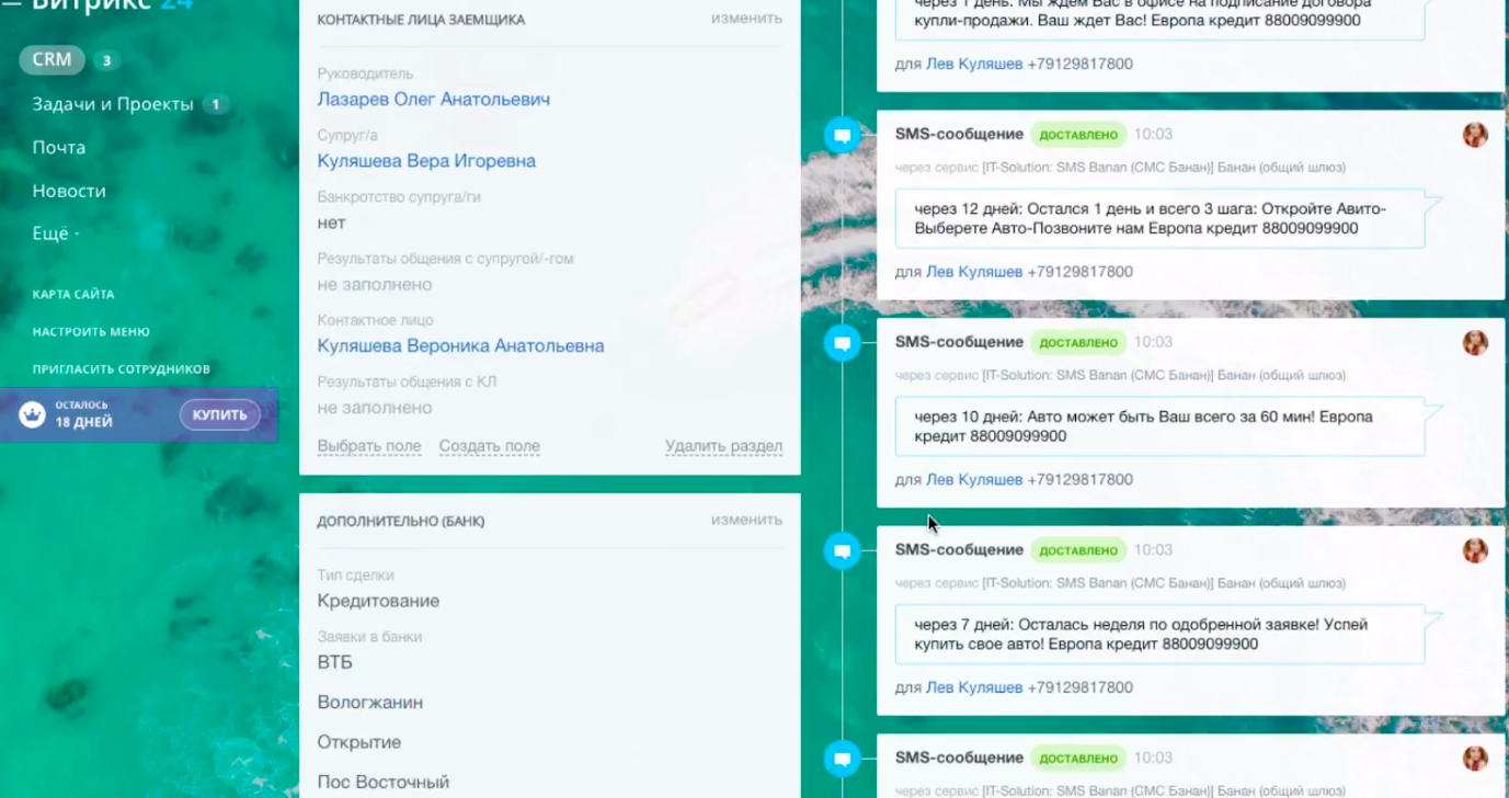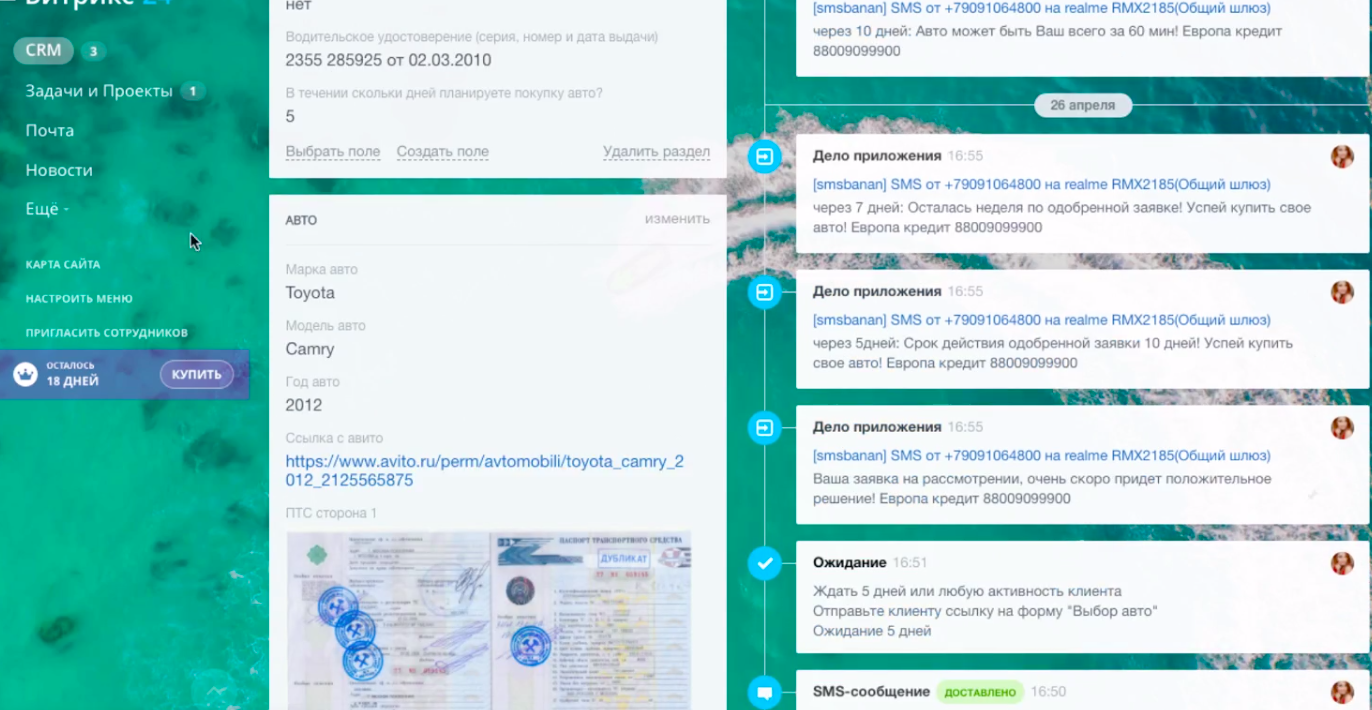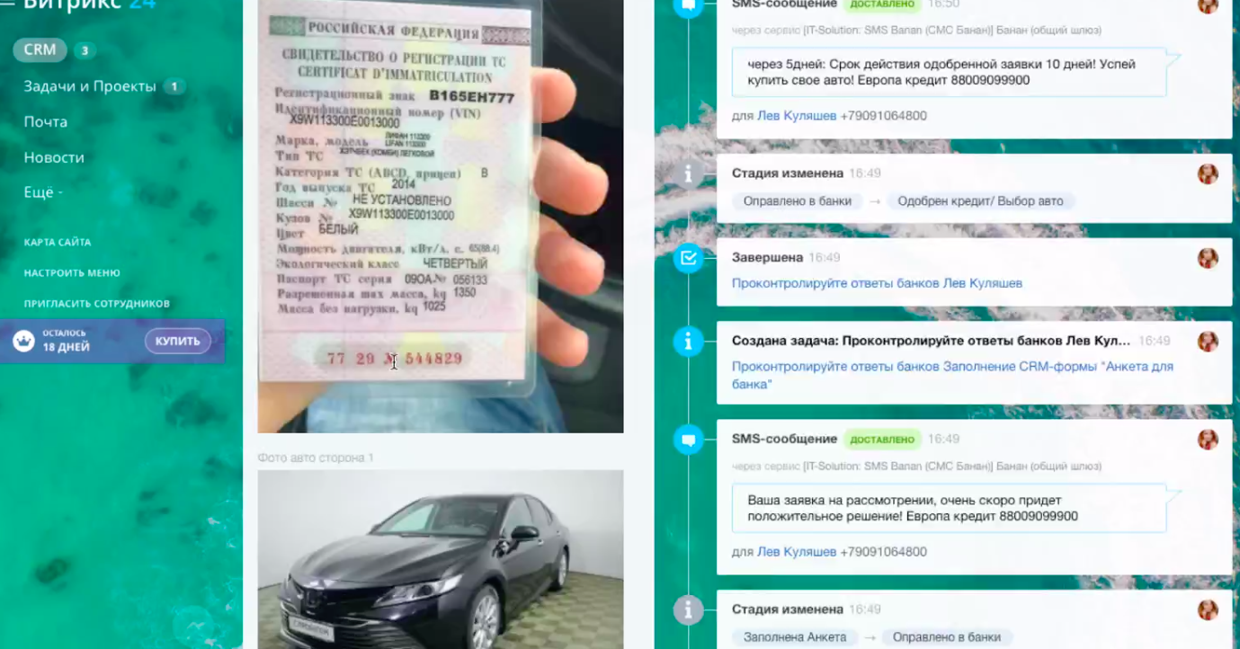 Решение АВТО КРЕДИТ подходит для большинства компаний, которые занимаются куплей - продажей автомобилей, автоброкерам, автосалонам и тем, кто помогает своим клиентам купить авто в кредит. В системе уже есть все необходимые поля для работы с автокредитованием и лизингом. Важные смс уведомления клиентам участвуют в сценариях автоматизации. Создаются все дополнительные связи заемщика: супруг/а, руководитель, прочее контактное лицо и остаются в вашей клиентской базе. Сотрудникам ставятся задачи в автоматическом режиме с напоминанием целевых действий. Отлавливаются действия клиента. Например, клиент получит смс, когда отправил заявку или заполнил анкету для банка.