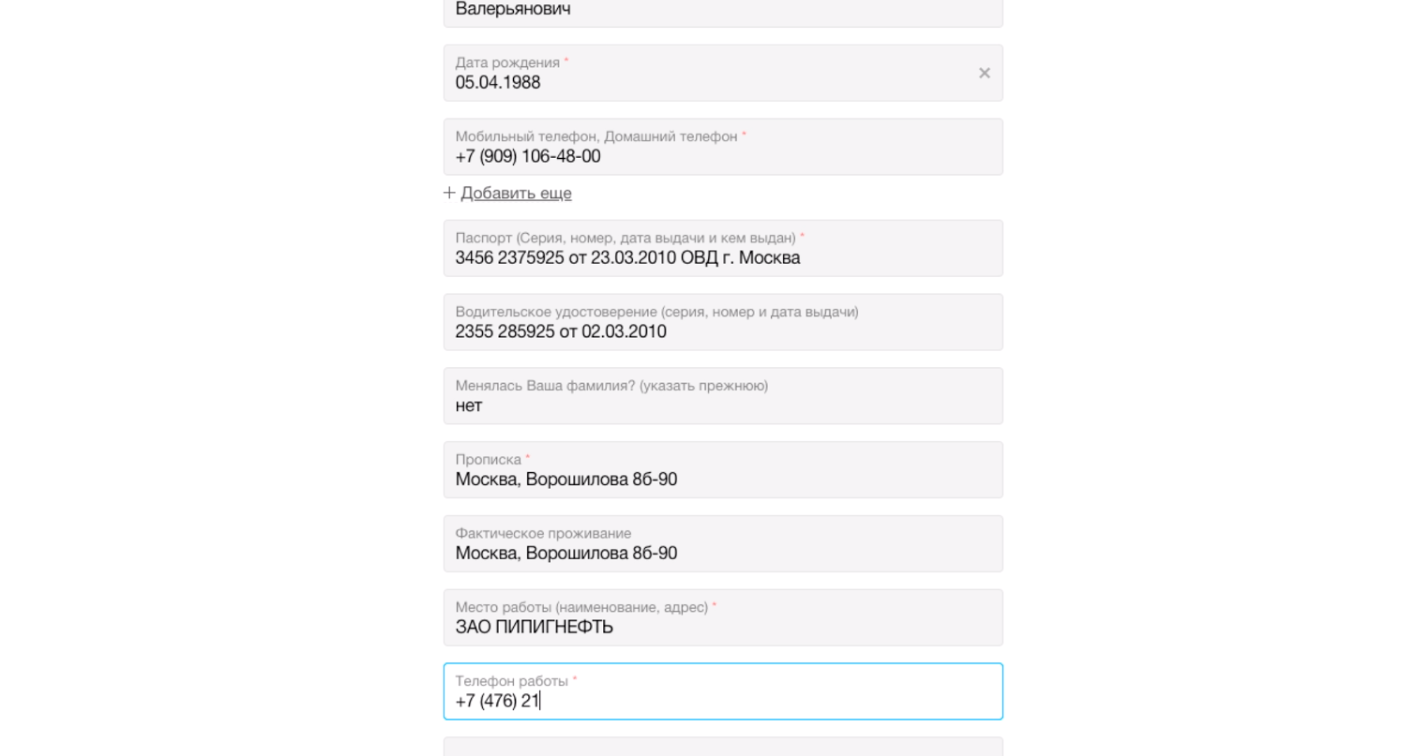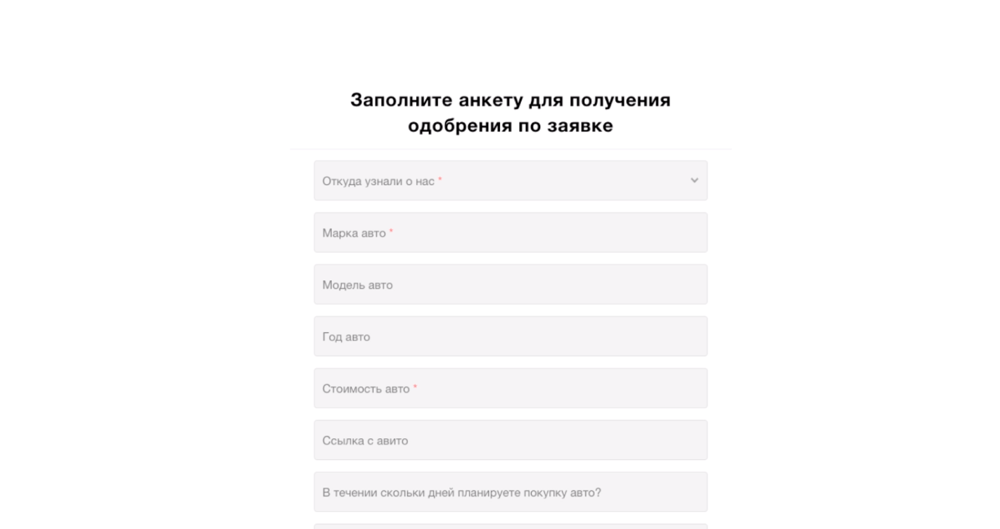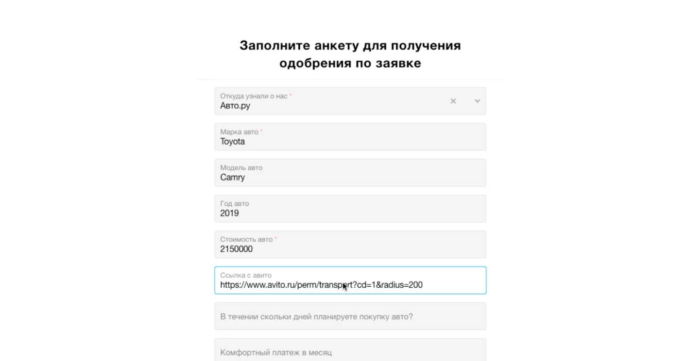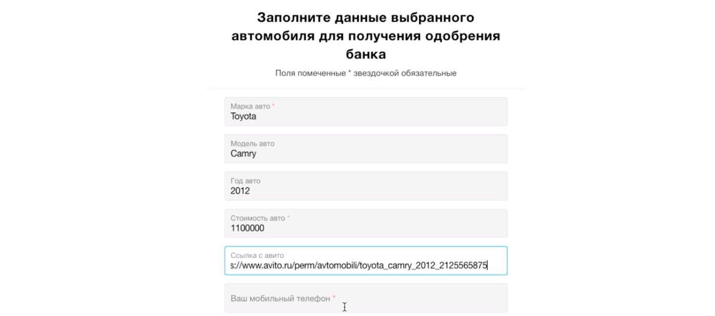 В системе уже есть все необходимые поля для работы с выбранным автомобилем. Заемщик может быстро и легко отправить форму на выбранный авто, сидя в салоне автомобиля.