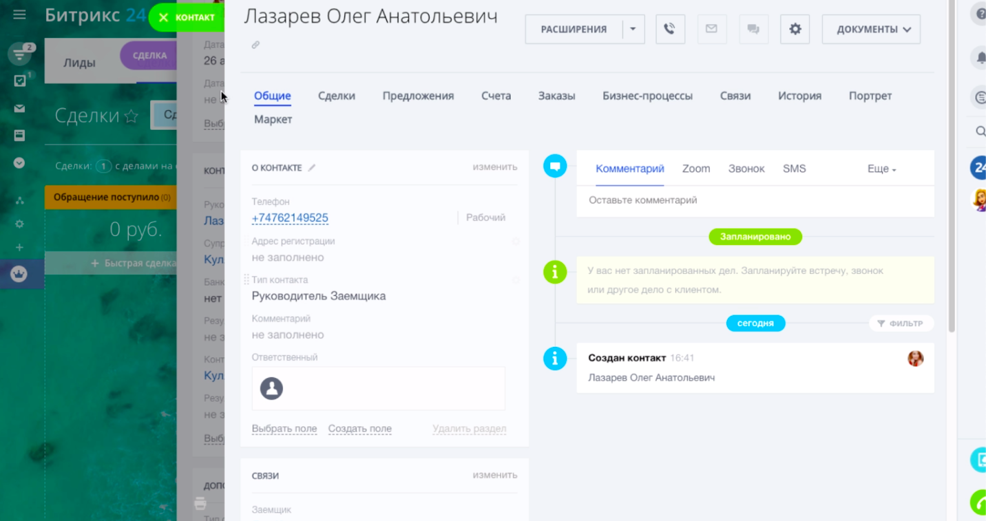 - Автоматическое прикрепление информации контактных лиц заемщика