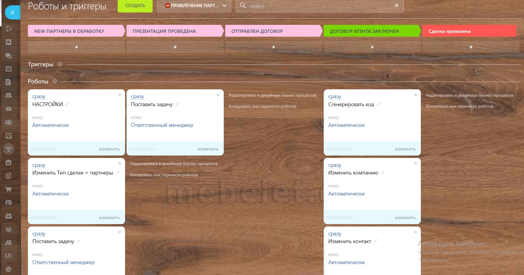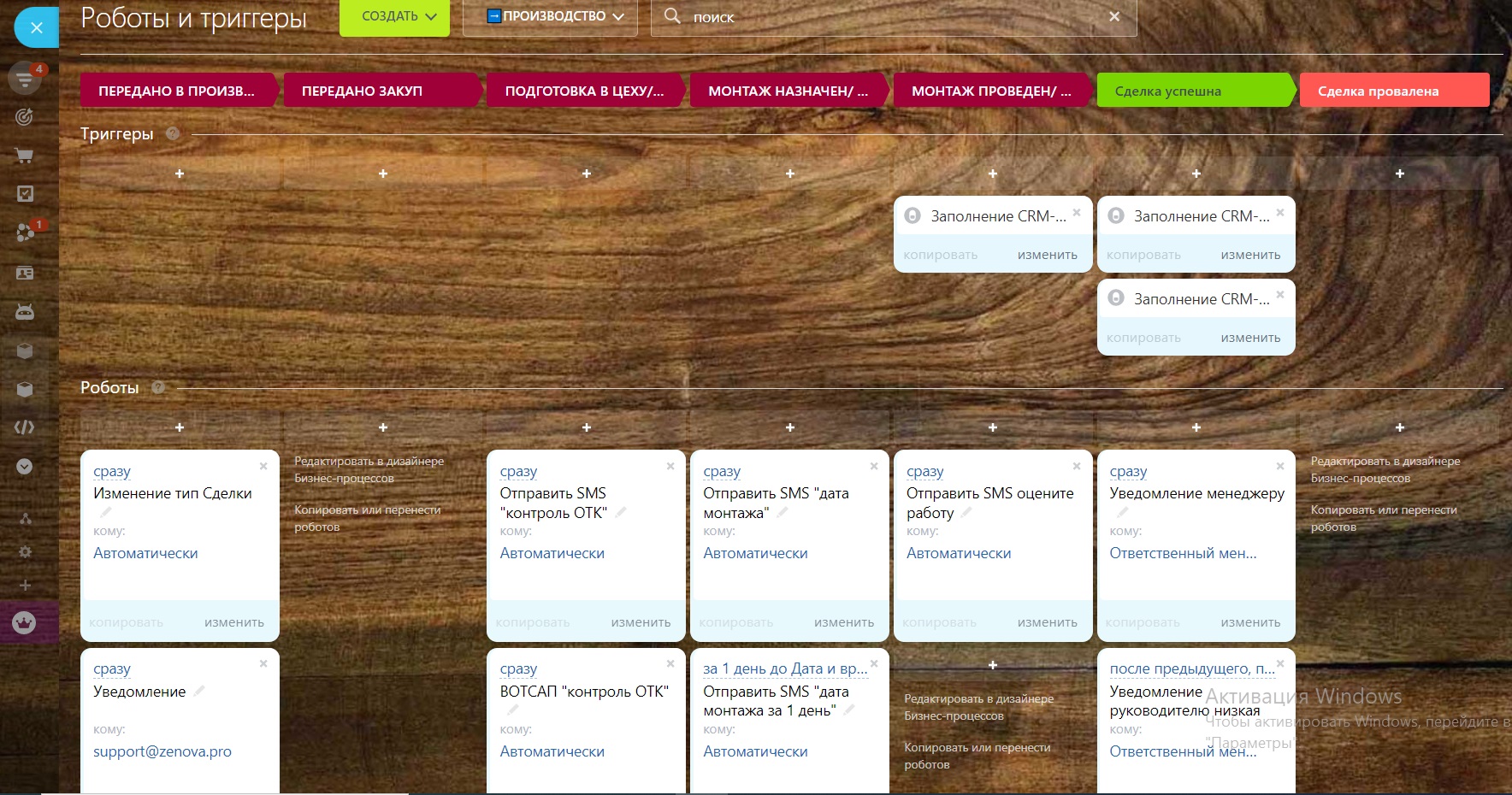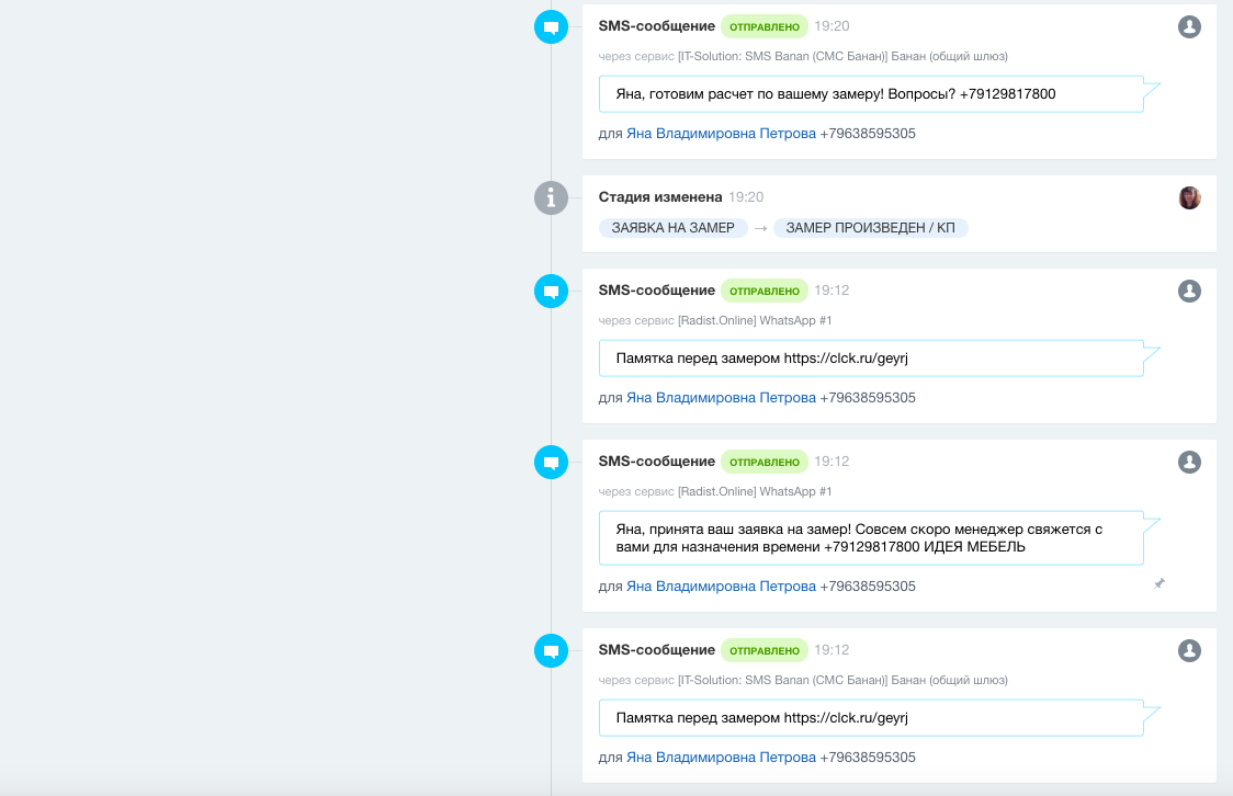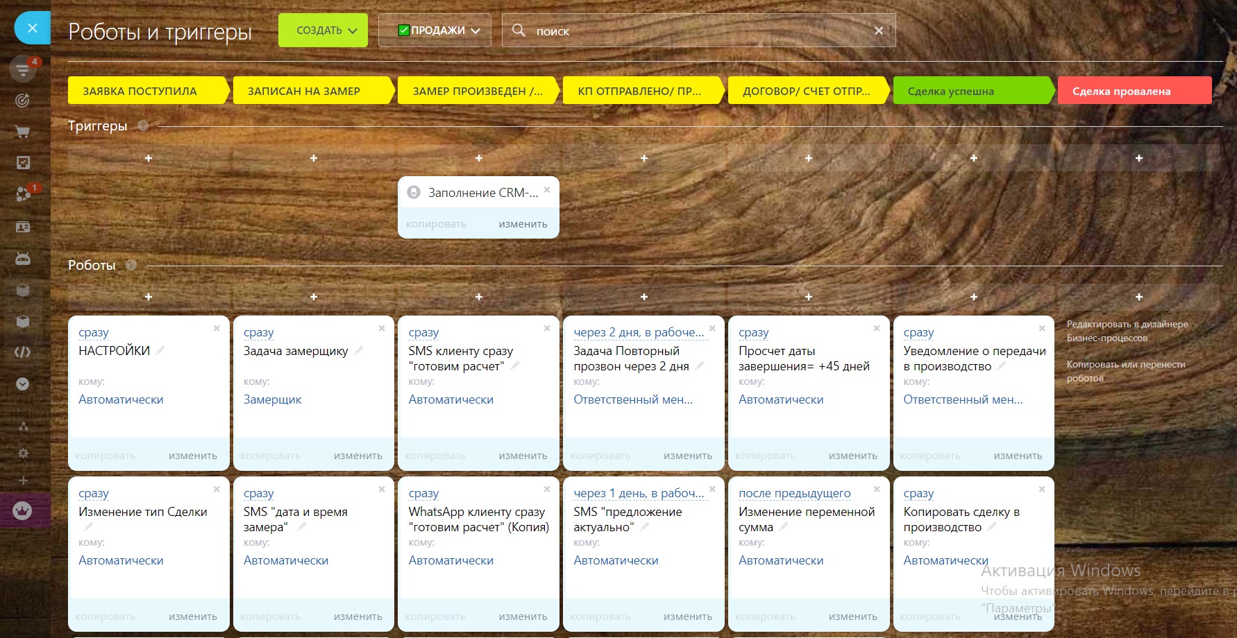 CRM производство мебели помогает работать как компании внутри, так и с клиентами в автоматическом режиме. В данном решении корректно учтены все этапы для правильного расчета конверсии, контроля менеджеров и отработки рекламного бюджета! Автоматические Вотсап и смс сообщения удерживают клиента, пока он особенно горячий, в течение 7 дней. Мы стремимся свести к минимуму трудозатраты и человеческий фактор. Готовая CRM прекрасно справляется с этой задачей!
