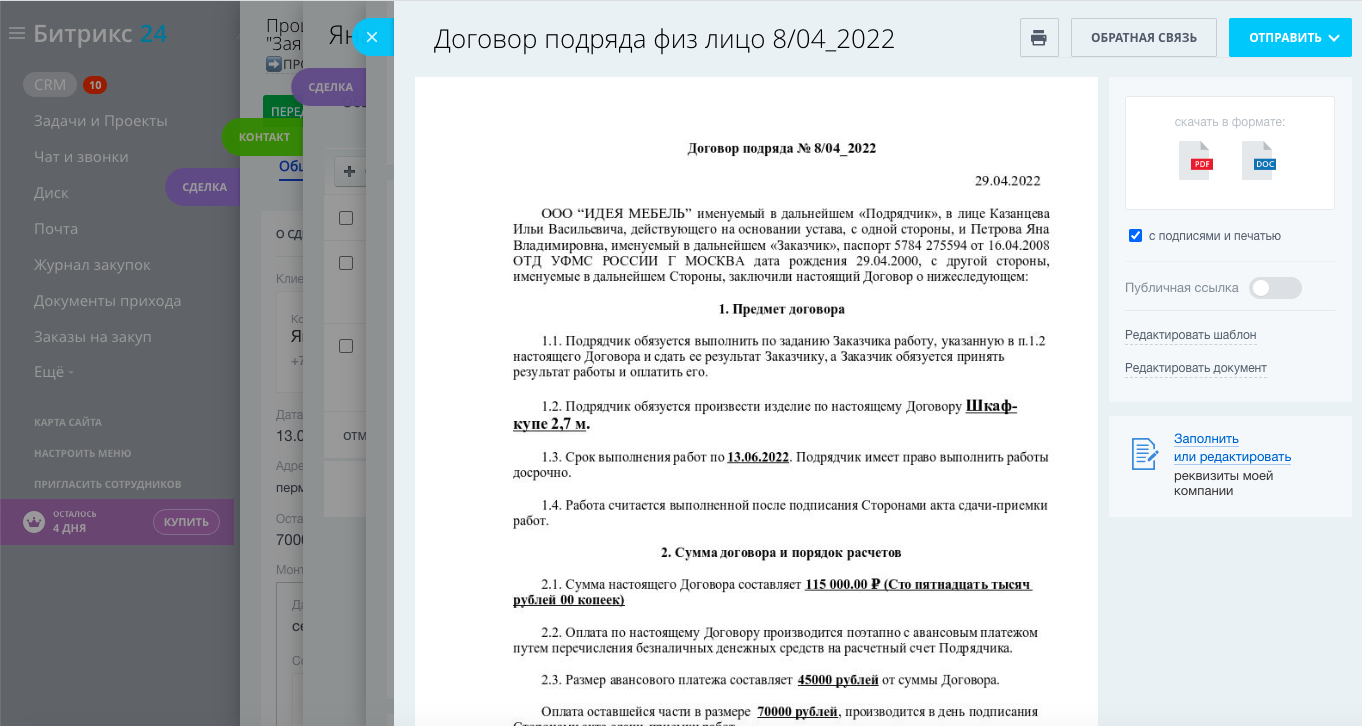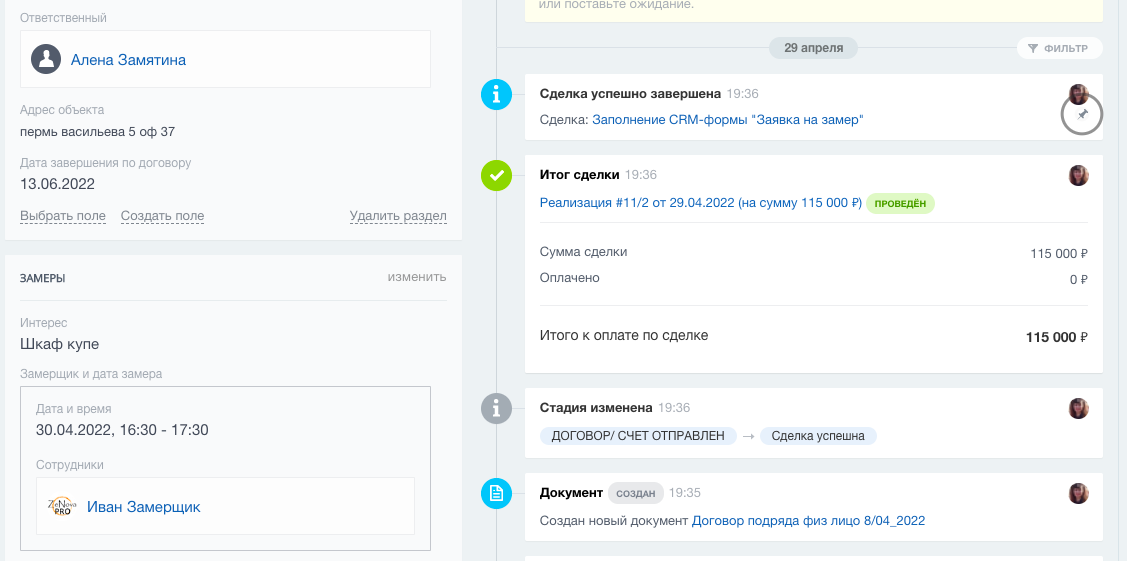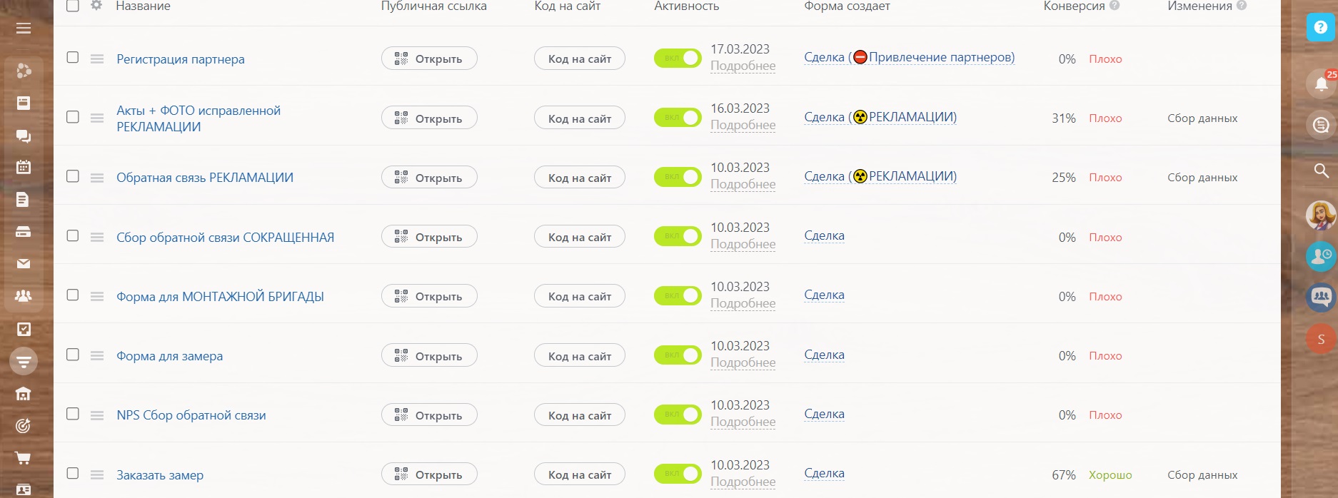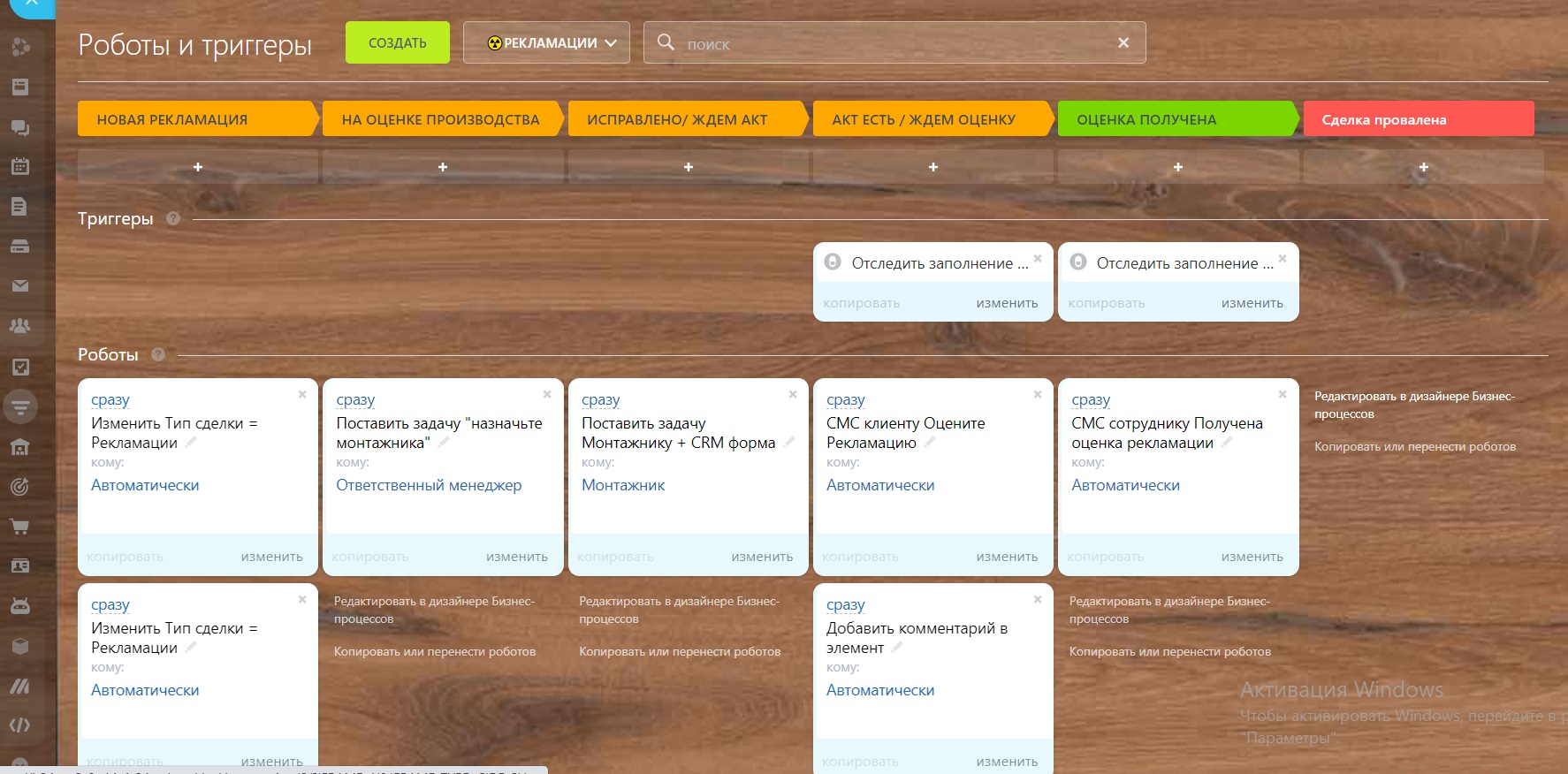 CRM производство мебели помогает работать как компании внутри, так и с клиентами в автоматическом режиме. В данном решении корректно учтены все этапы для правильного расчета конверсии, контроля менеджеров и отработки рекламного бюджета! Автоматические Вотсап и смс сообщения удерживают клиента, пока он особенно горячий, в течение 7 дней. Мы стремимся свести к минимуму трудозатраты и человеческий фактор. Готовая CRM прекрасно справляется с этой задачей!