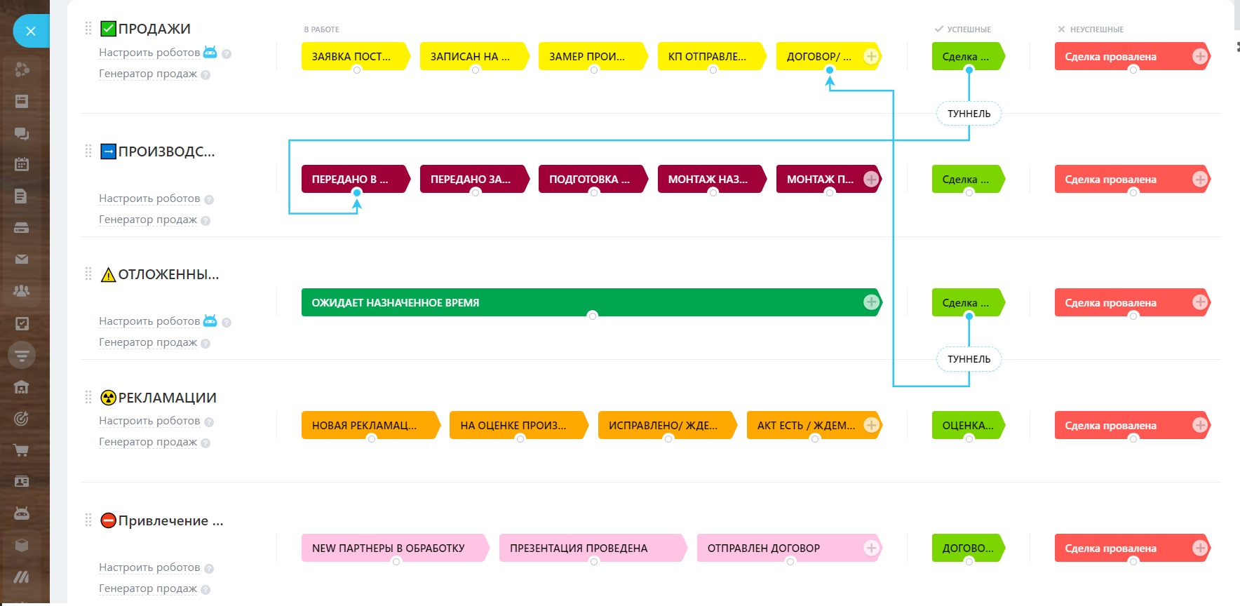 Стадии воронки продаж созданы с учетом постройки правильной аналитики, анализа отработки рекламного бюджета и конверсии продаж: